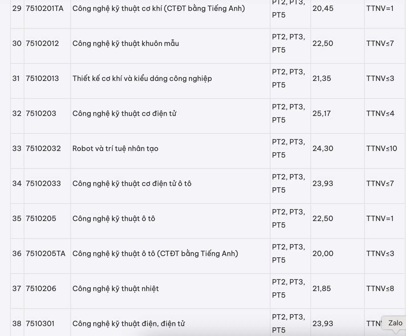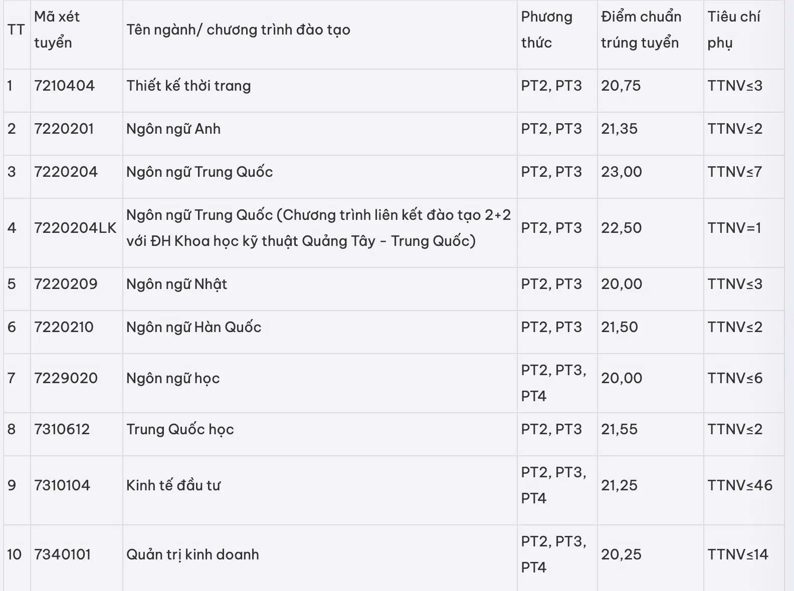 Điểm chuẩn các ngành còn lại từ 20 điểm đến 23,56 điểm.