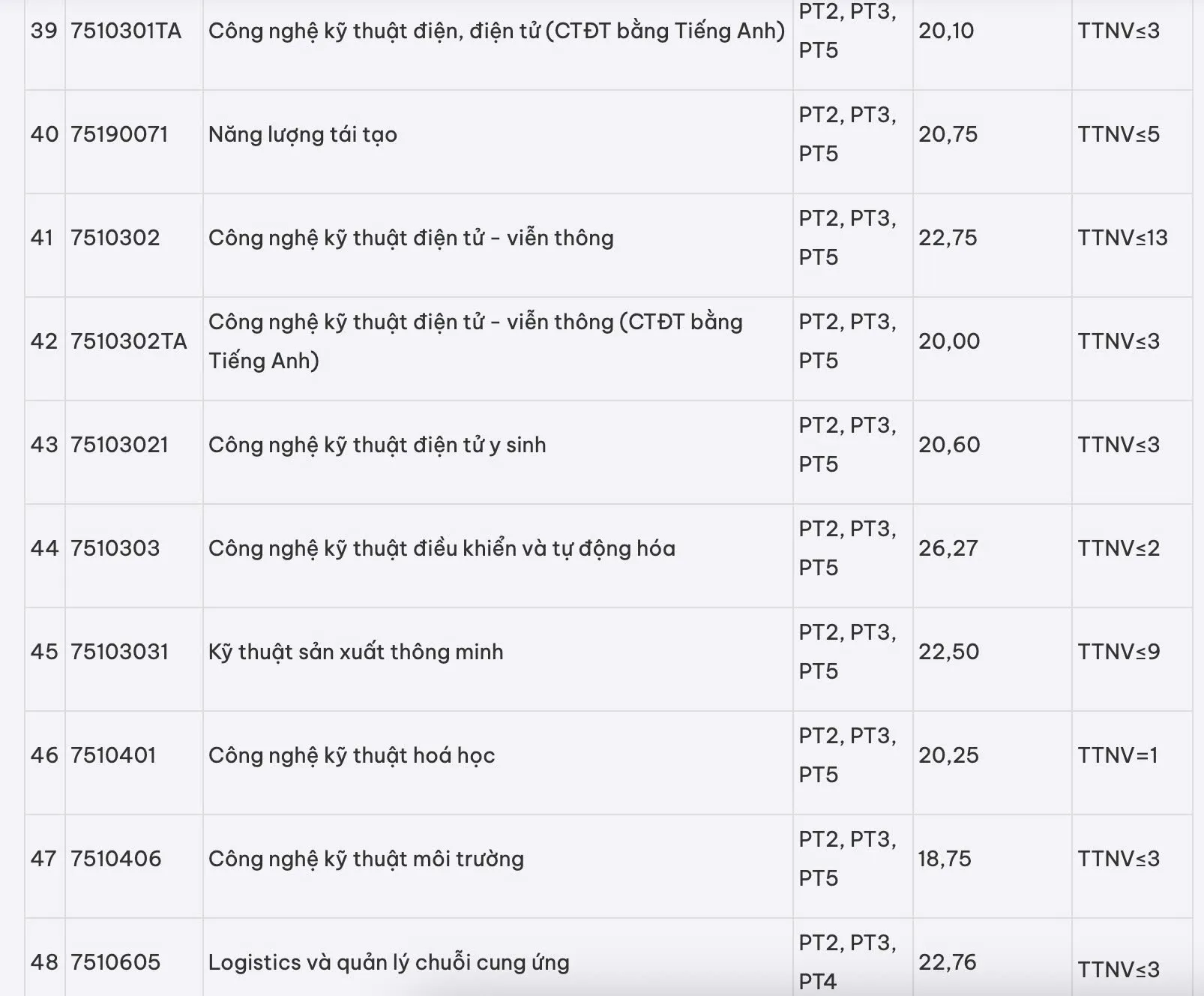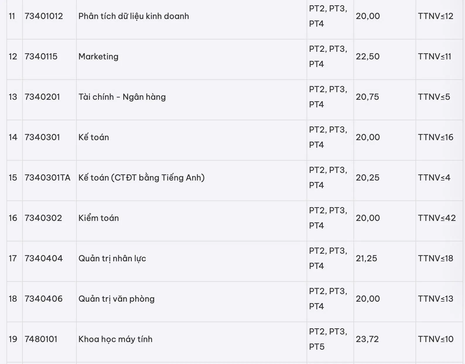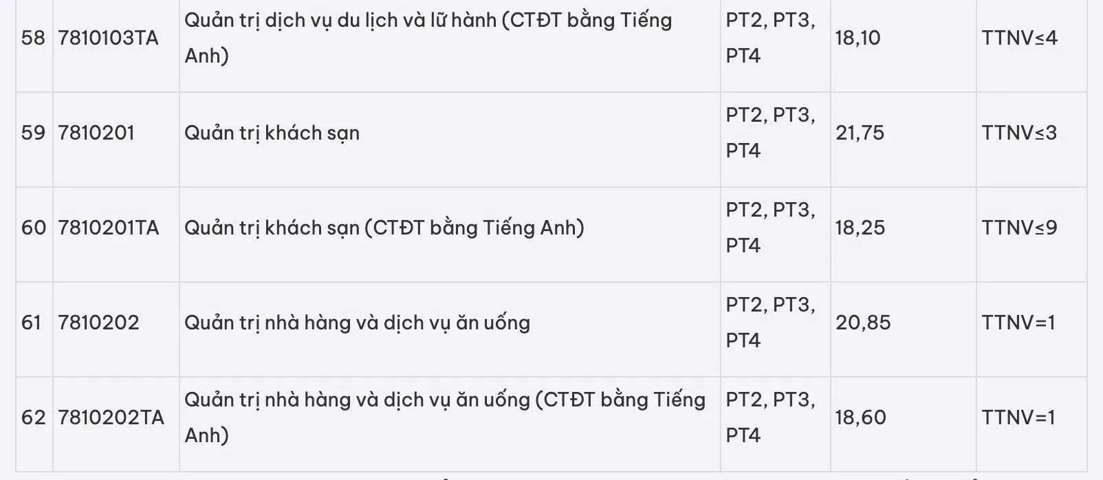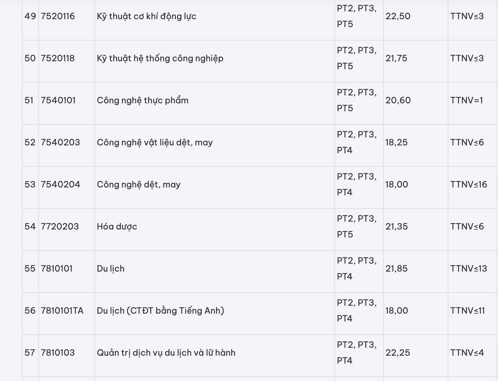 Một số ngành dưới 20 như Công nghệ dệt, may và Du lịch chương trình đào tạo bằng tiếng Anh (18), Quản trị dịch vụ du lịch và lữ hành chương trình đào tạo bằng tiếng Anh (18,1), Quản trị khách sạn chương trình đào tạo bằng tiếng Anh (18,25).
