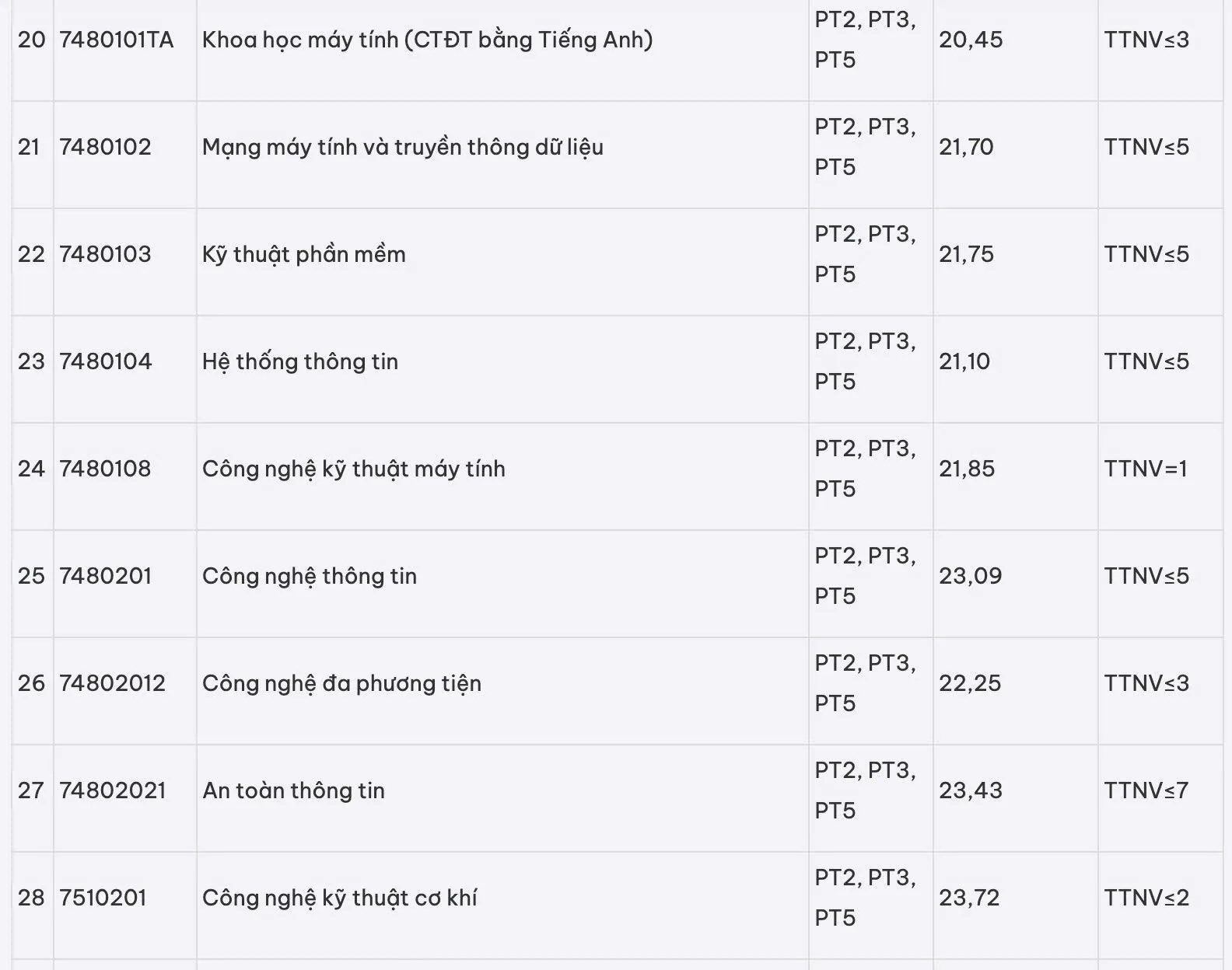 Riêng ngành Khoa học máy tính có điểm trúng tuyển là 36,4 với hệ số nhân đôi cho môn toán (tương đương trên 9 điểm/ môn). Các chương trình còn lại về cơ bản có ngưỡng điểm trúng tuyển tập trung vào khoảng từ 25 - 27 điểm.