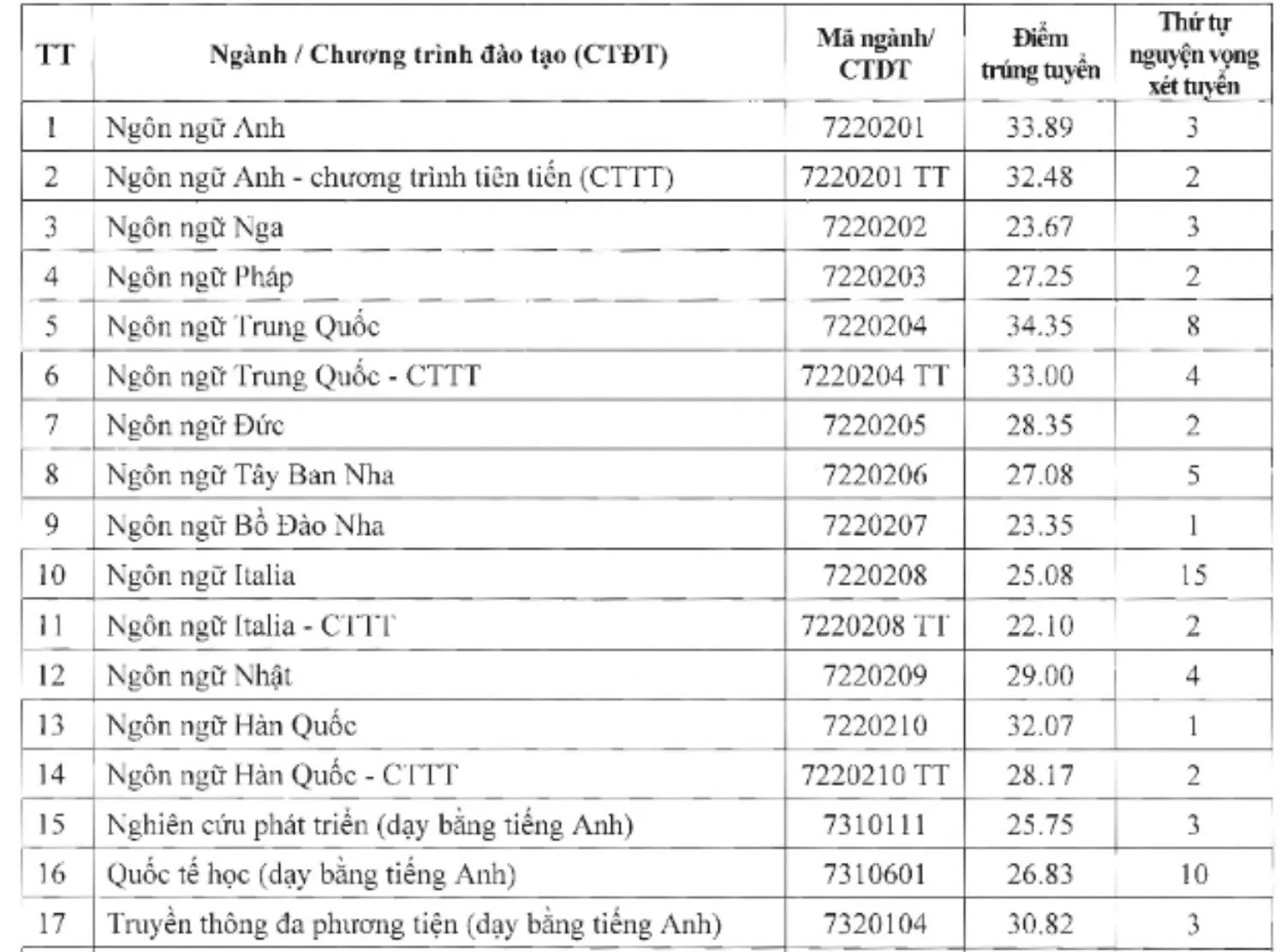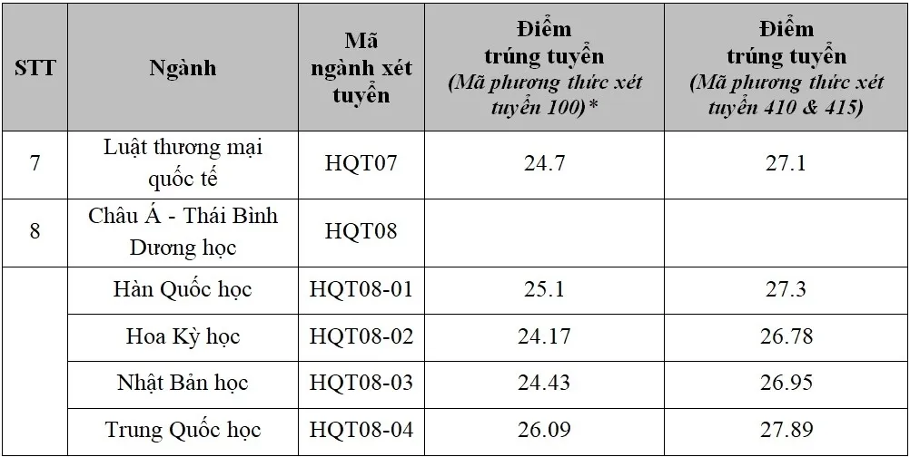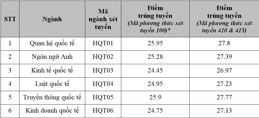 Ba ngành lấy điểm chuẩn từ 25 trở lên gồm Quan hệ quốc tế, Ngôn ngữ Anh, Truyền thông quốc tế. Các ngành còn lại đều có điểm chuẩn từ 24, thấp nhất là Hoa Kỳ học với 24,17 điểm.