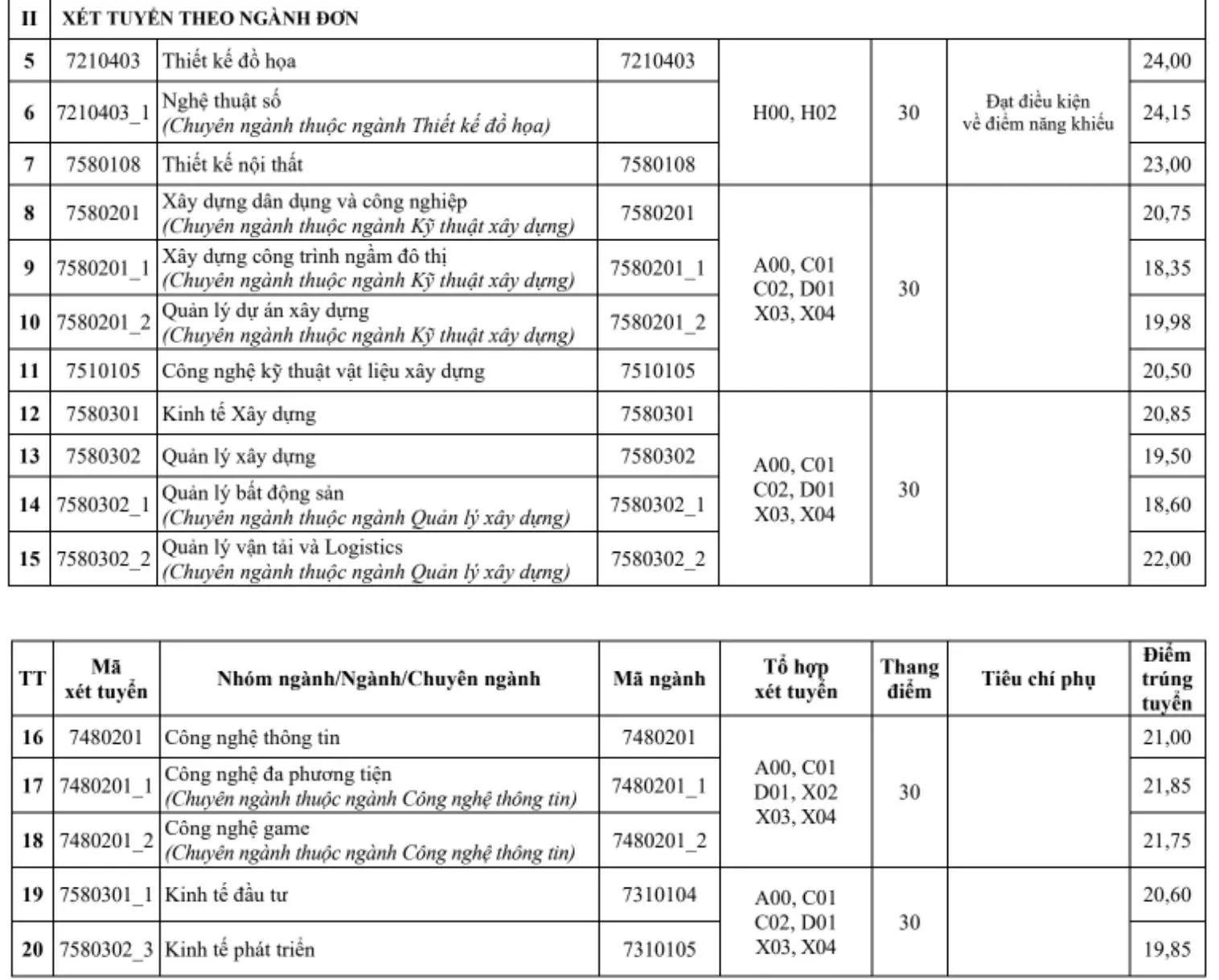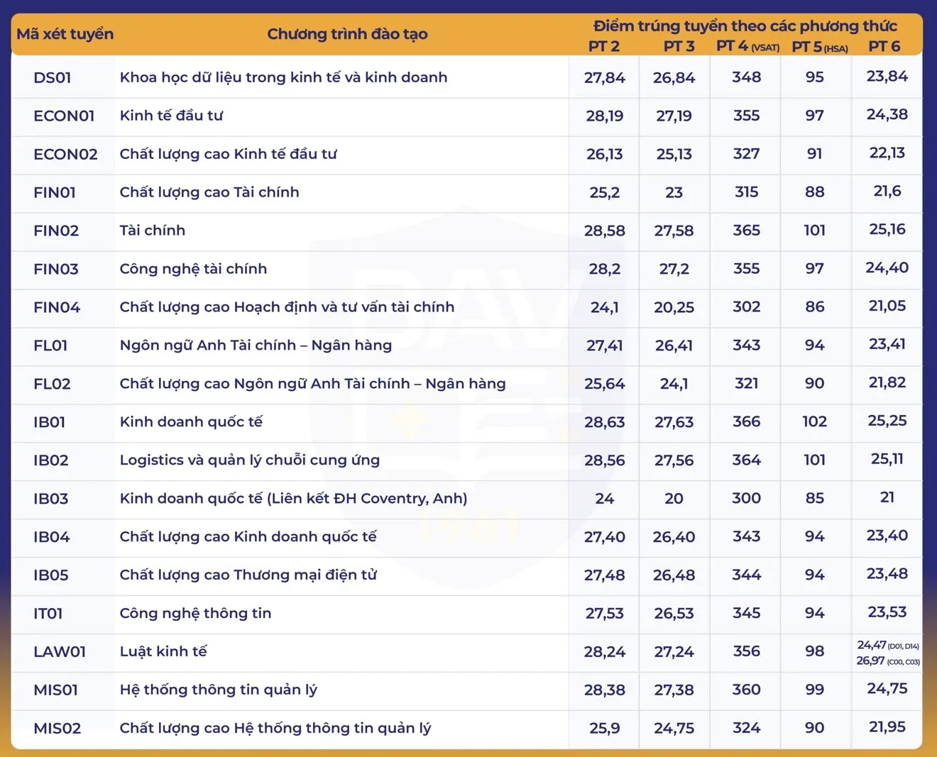 Mức này áp dụng với các tổ hợp A00 (Toán, Lý, Hóa), A01 (Toán, Lý, Anh), D01 (Toán, Văn, Anh), D03 (Toán, Lý, Sử), D04 (Toán, Lý, Địa), D06 (Toán, Hóa, Địa), DD2 (Toán, Văn, Tiếng Hàn), D07 (Toán, Hóa, Anh), D09 (Toán, Anh, Sử), D10 (Toán, Địa, Anh), D14 (Văn, Sử, Anh), D15 (Văn, Địa, Anh).