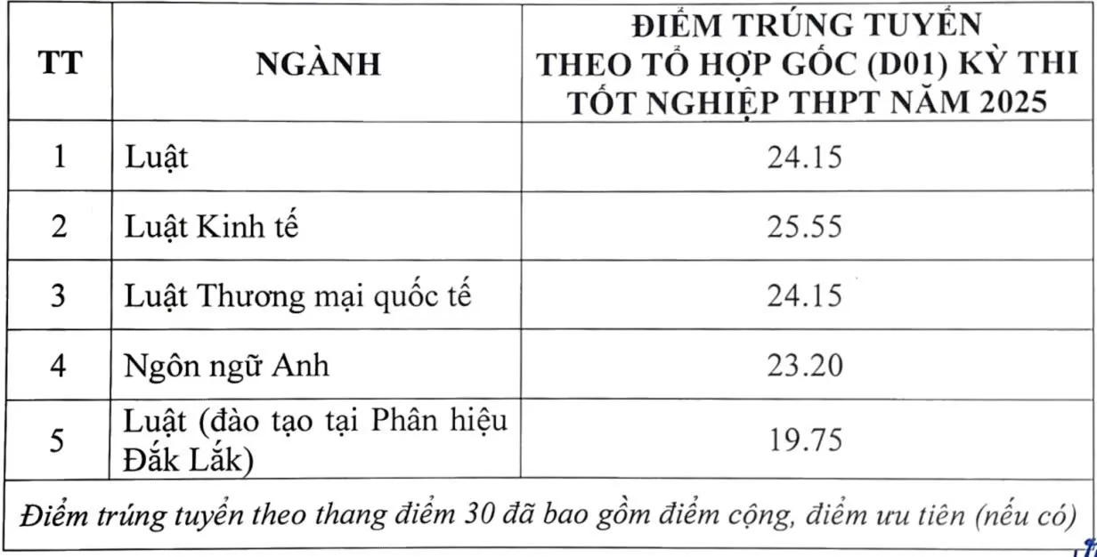 Trường Đại học Luật Hà Nội đã công bố điểm trúng tuyển trình độ đại học hình thức đào tạo chính quy năm 2025 (Khoá 50) theo tổ hợp gốc D01 kỳ thi tốt nghiệp THPT năm 2025.