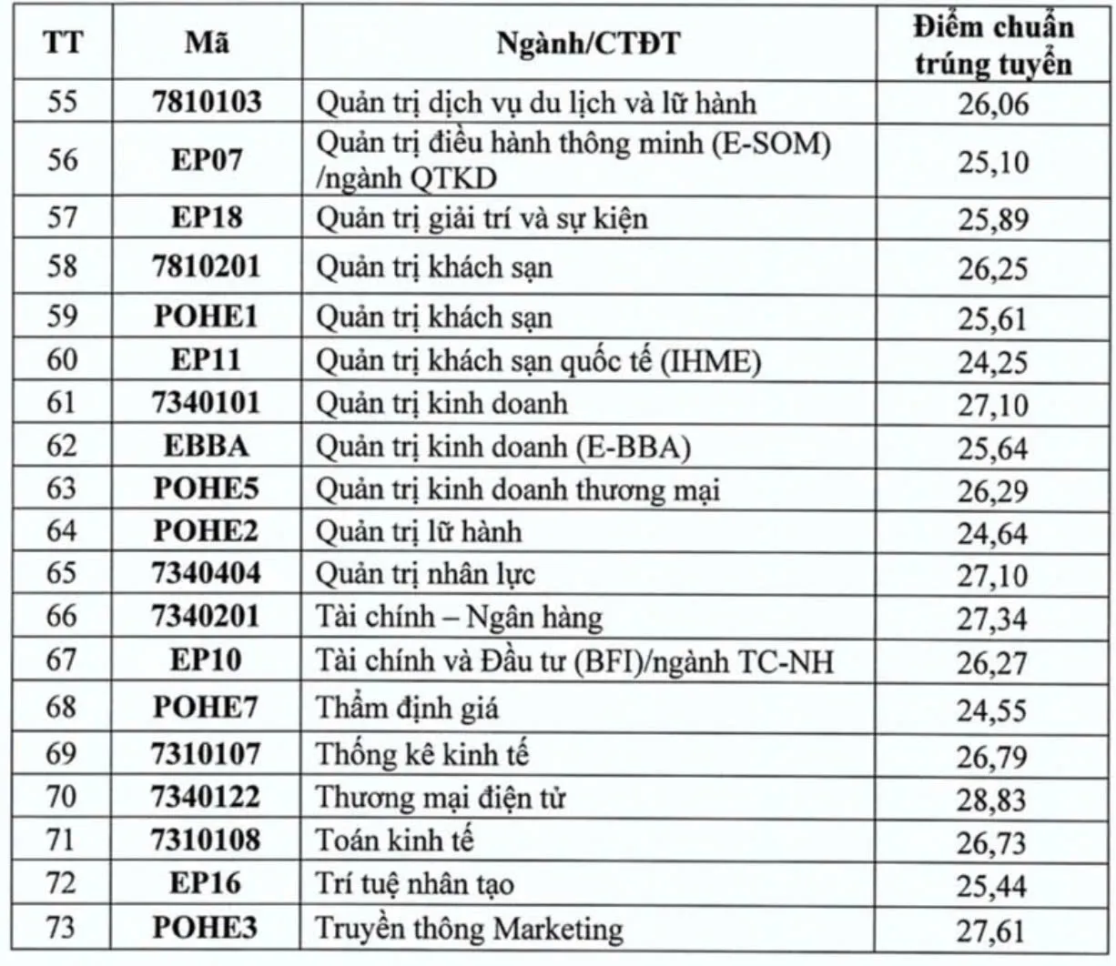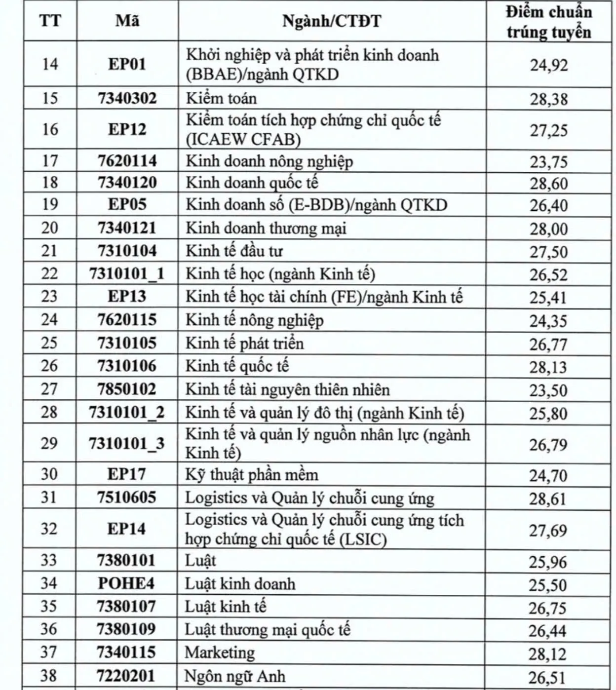 Trường Đại học Ngoại thương (FTU) cho biết: các chương trình trúng tuyển có điểm trên 28 điểm, bao gồm: chương trình tiên tiến kinh tế đối ngoại với điểm trúng tuyển là 28,5, chương trình tiên tiến i-Hons Kinh doanh quốc tế và Phân tích dữ liệu kinh doanh và chương trình tiêu chuẩn Kinh doanh quốc tế đều có ngưỡng điểm trúng tuyển là 28.