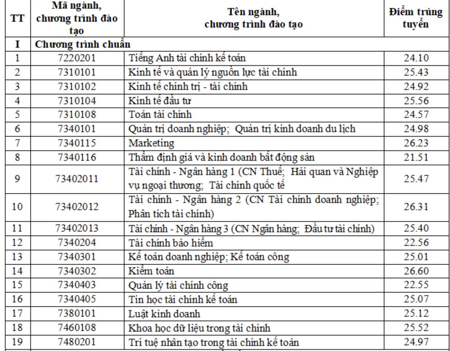 12 ngành lấy điểm thấp nhất từ 21 điểm. Điểm chuẩn các ngành còn lại trong khoảng 22,55 - 25,56.