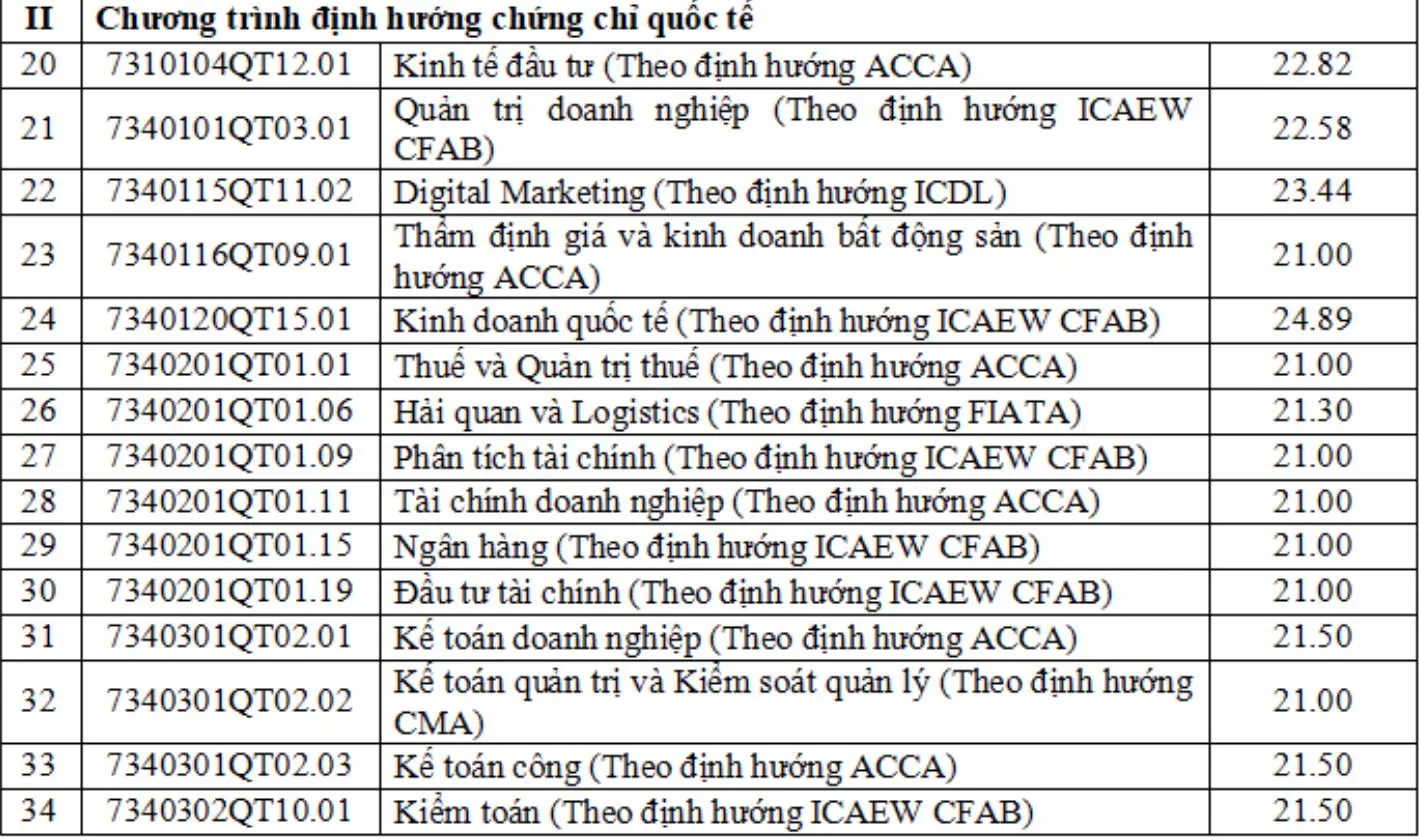 Tiếp đến là 6 chương trình có điểm trúng tuyển trên 27, gồm: chương trình định hướng nghề nghiệp logistics và quản lý chuỗi cung ứng, chương trình tiêu chuẩn kinh tế đối ngoại, chương trình chất lượng cao kinh tế đối ngoại, chương trình chất lượng cao kinh doanh quốc tế, chương trình marketing số, chương trình tiên tiến tài chính - ngân hàng.