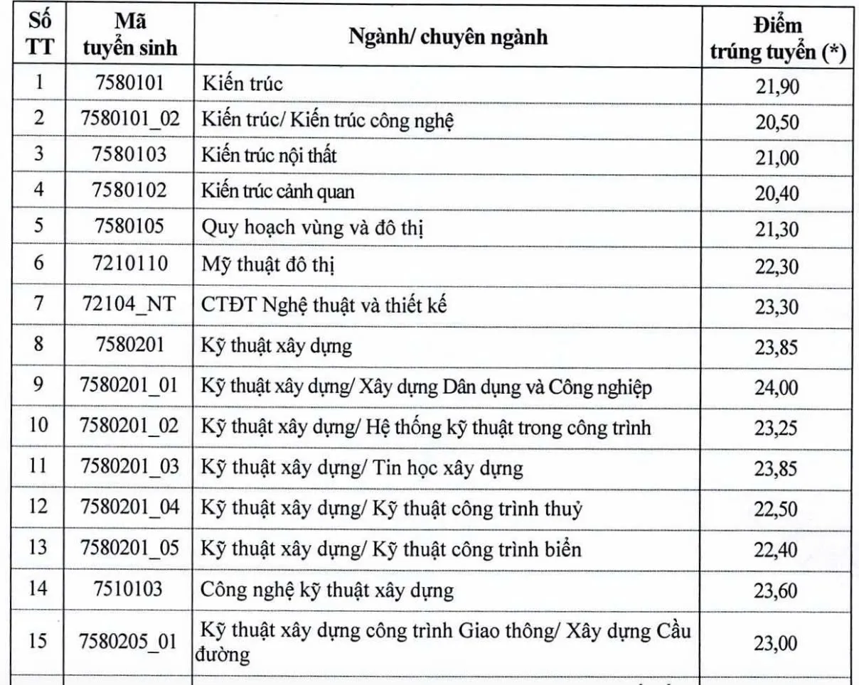 Trường Đại học Kiến trúc Hà Nội công bố điểm chuẩn năm 2025 từ 16,1 - 24,15 (thang 30) và khoảng 24,85 - 26,25 (thang 40).