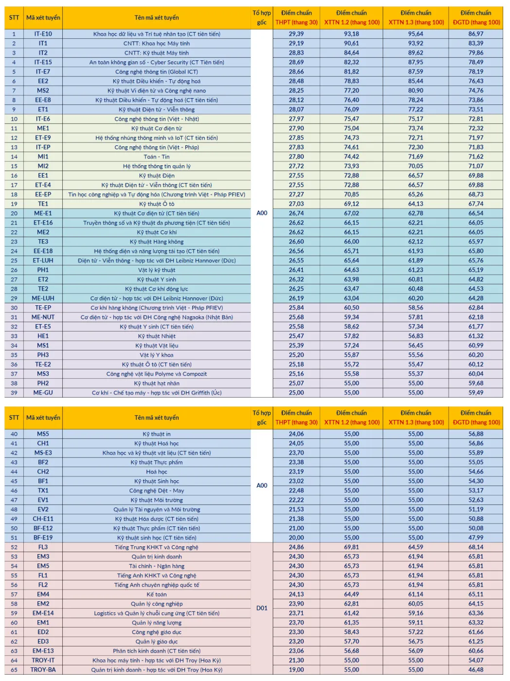 Chương trình tiên tiến Khoa học dữ liệu và Trí tuệ nhân tạo (IT-E10) có điểm chuẩn cao nhất là 29,39 điểm theo điểm thi tốt nghiệp THPT. Tiếp theo là Chương trình Khoa học máy tính (IT1) có điểm chuẩn là 29,19 điểm. Các ngành “hot” đều có điểm chuẩn rất cao như Chương trình Kỹ thuật Điều khiển - Tự động hoá (EE2) có điểm chuẩn là 28,48 điểm; Chương trình Kỹ thuật Vi điện tử và Công nghệ nano (MS2) có điểm chuẩn là 28,25; Chương trình Kỹ thuật Điện tử - Viễn thông (ET1) có điểm chuẩn là 28,07 điểm. Chương trình có điểm chuẩn thấp nhất năm nay là TROY-BA với mức điểm là 19,00 điểm theo điểm thi tốt nghiệp THPT.