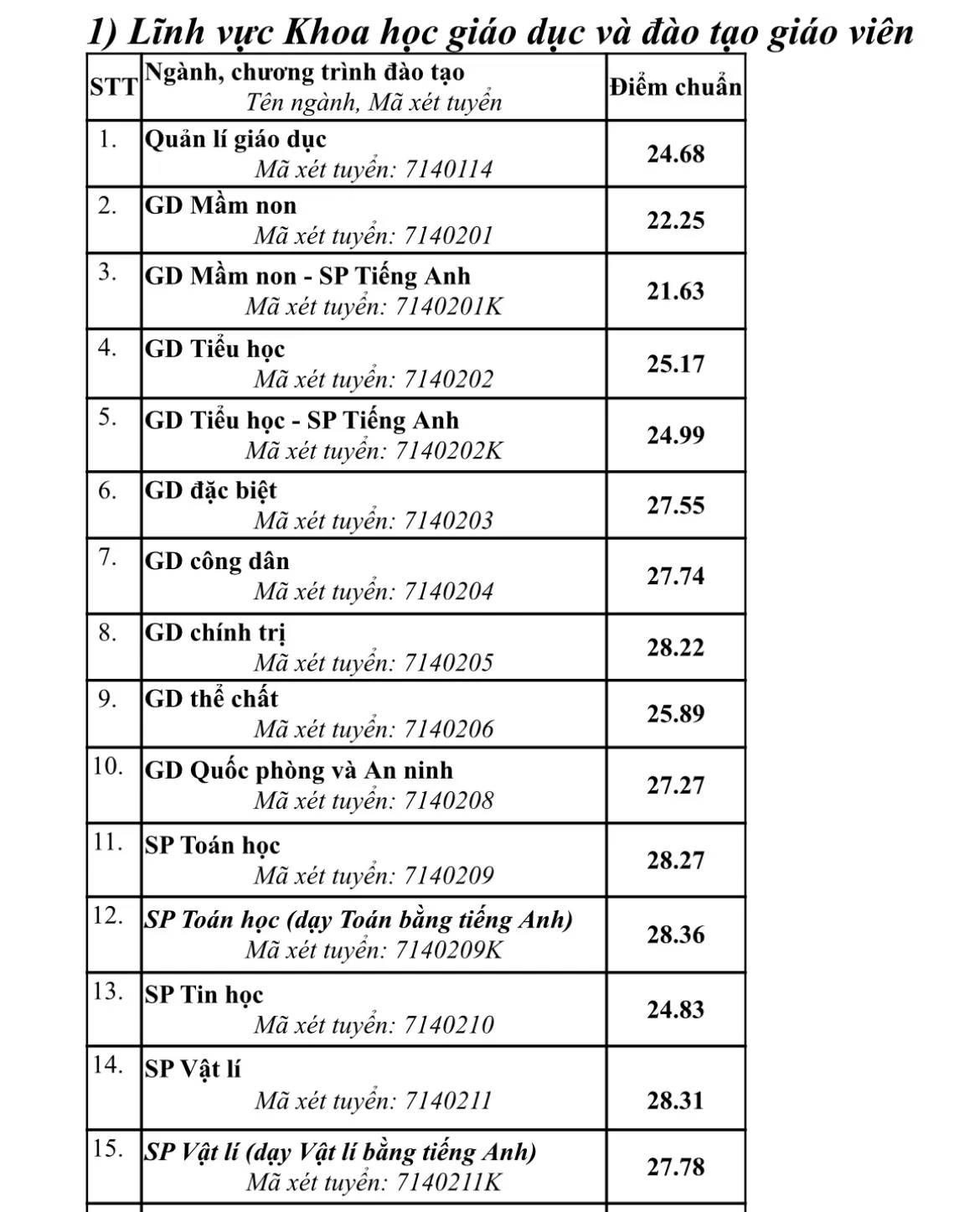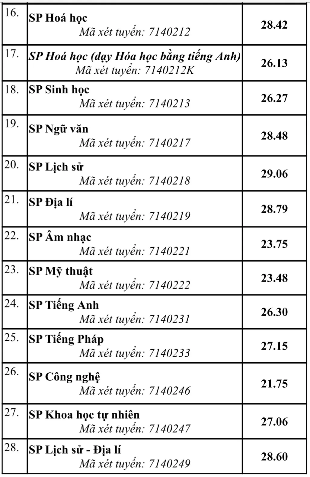 Các ngành sư phạm có điểm chuẩn trên 28 gồm: Sư phạm địa lý (28,79); Sư phạm lịch sử - địa lý (28,6); Sư phạm ngữ văn (28,48); Sư phạm hoá học (28,42); Sư phạm toán dạy bằng tiếng Anh (28,36); Sư phạm vật lý (28,31); Sư phạm toán (28,27), Sư phạm chính trị (28,22).