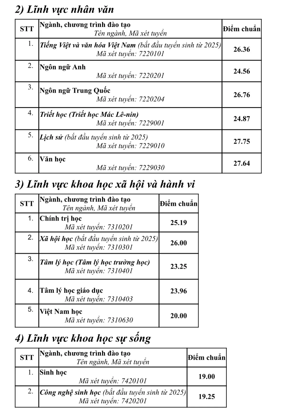 Lĩnh vực nhân văn có điểm chuẩn cao nhất là ngành lịch sử (bắt đầu tuyển sinh năm 2025) với điểm chuẩn 27,75; ngành văn học với 27,64. Lĩnh vực khoa học xã hội hành vi, điểm chuẩn cao nhất là 26 của ngành Xã hội học. Ngành này cũng bắt đầu tuyển sinh từ năm nay.