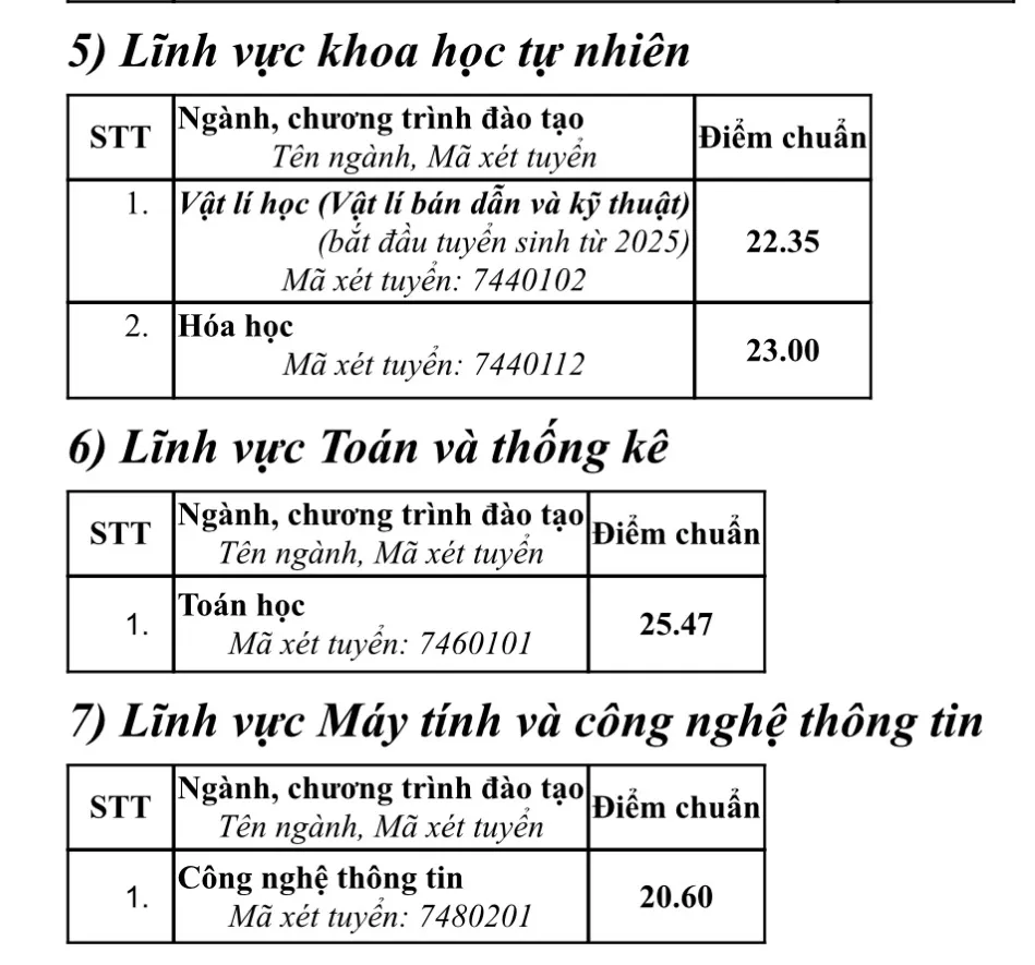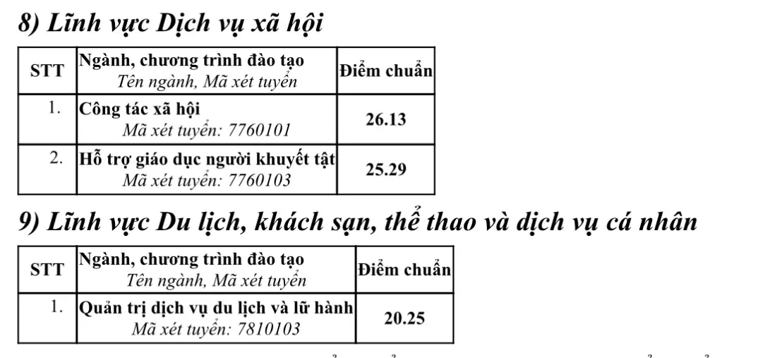 Lĩnh vực dịch vụ xã hội điểm chuẩn cao nhất là 26,13. Lĩnh vực toán thống kê lấy điểm chuẩn là 25,47 (ngành toán học); lĩnh vực khoa học tự nhiên lấy điểm chuẩn từ 22,35 - 23 điểm. Lĩnh vực máy tính và công nghệ thông tin lấy điểm chuẩn 20,6; lĩnh vực du lịch khách sạn và dịch vụ cá nhân lấy điểm chuẩn 20,25. Điểm chuẩn thấp nhất thuộc ngành khoa học sự sống với điểm chuẩn 19 – 19,25 điểm.