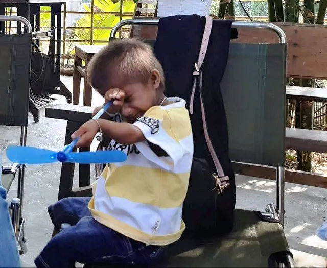 Bên cạnh thầy Đặng Văn Cương và người thân, cậu bé như một chú búp bê nhỏ, ngập tràn hạnh phúc, không ngừng nghịch ngợm chiếc chong chóng nhỏ. Thấy người lạ lại mỉm cười bẽn lẽn.