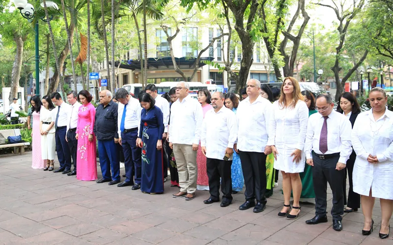 Kinhtedothi - Chiều 9/6, trong khuôn khổ chuyến thăm tới Việt Nam, Đoàn đại biểu cấp cao Thành ủy La Habana do Bí thư thứ nhất Thành ủy La Habana Luis Antonio Torres Iríbar làm trưởng đoàn đã đặt hoa tưởng niệm Anh hùng dân tộc Cuba José Martí trước tượng đài của ông tại vườn hoa Tao Đàn.