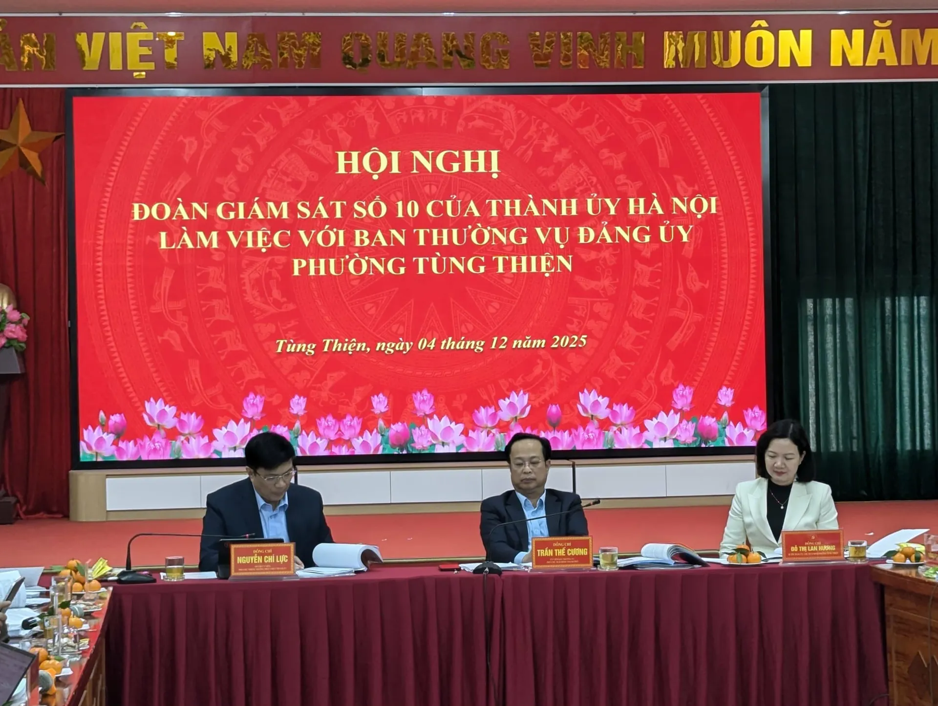Kinhtedothi - Chiều nay (4/12), Đoàn Giám sát số 10 của Ban Thường vụ Thành ủy Hà Nội có buổi làm việc với Ban Thường vụ Đảng ủy phường Tùng Thiện để giám sát công tác lãnh đạo, chỉ đạo, tổ chức thực hiện một số chuyên đề trọng tâm, cấp bách gắn với công tác kiểm điểm cuối năm 2025. Ủy viên Ban Thường vụ Thành ủy, Phó Chủ tịch Thường trực HĐND TP Hà Nội Trần Thế Cương làm Trưởng đoàn.