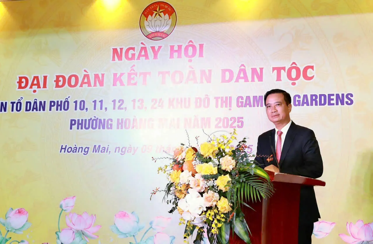 Bí thư Đảng ủy, Chủ tịch HĐND phường Hoàng Mai Nguyễn Xuân Linh phát biểu tại Ngày hội Đại đoàn kết toàn dân tộc.