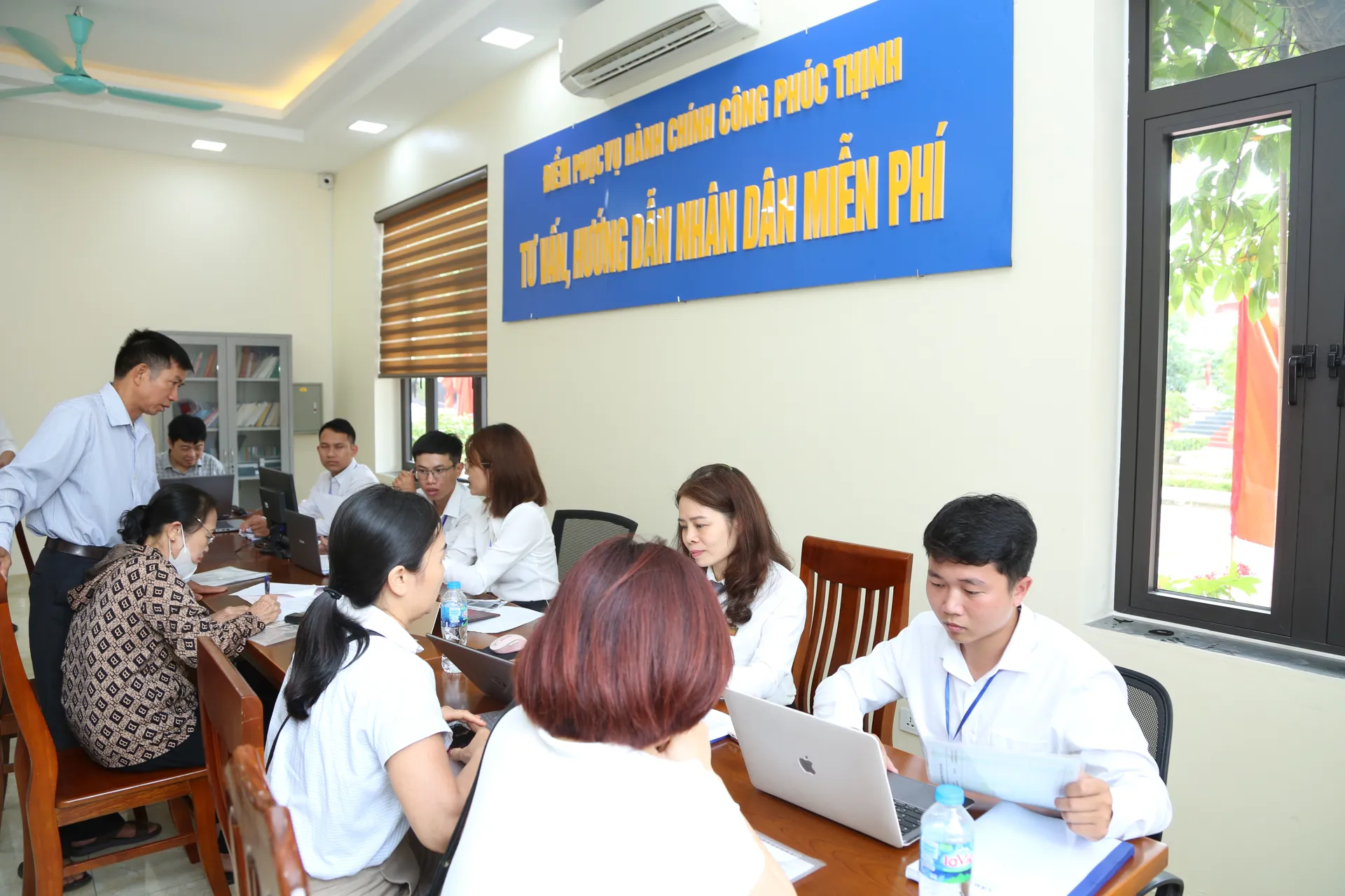 Hướng dẫn người dân làm thủ tục hành chính tại UBND xã Phúc Thịnh, Hà Nội. Ảnh: Phạm Hùng