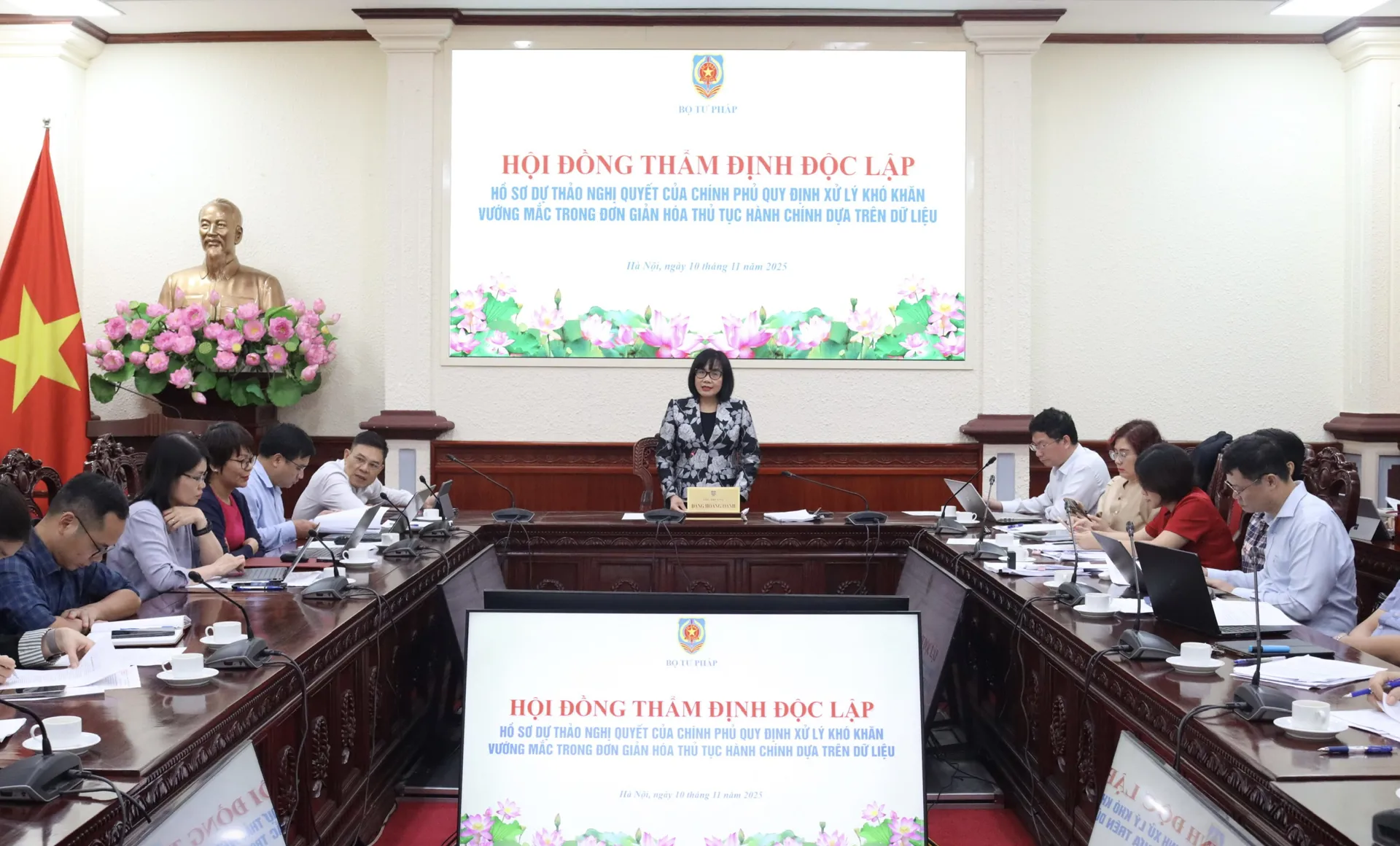 Kinhtedothi - Ngày 10/11, Thứ trưởng Bộ Tư pháp Đặng Hoàng Oanh chủ trì Hội đồng thẩm định độc lập Hồ sơ dự thảo Nghị quyết của Chính phủ quy định xử lý khó khăn, vướng mắc trong đơn giản hóa thủ tục hành chính dựa trên dữ liệu.