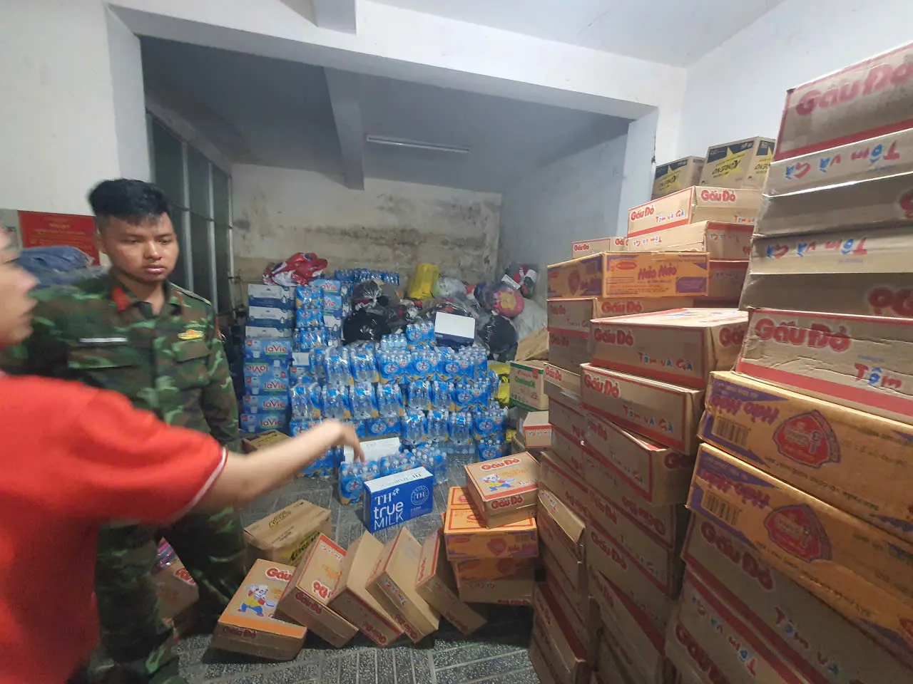 Những mặt hàng thiết yếu do các nhà hảo tâm tài trợ được tập kết về Hội Chữ thập đỏ tỉnh Đồng Nai trước khi di chuyển ra vùng bão lũ.