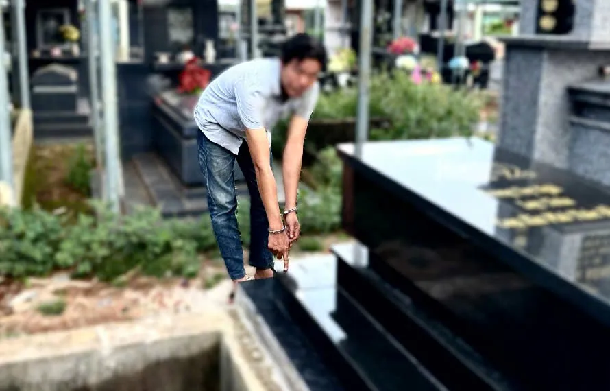 Đối tượng T.M.N tại ngôi mộ ông Phạm Hữu T sau khi được gia đình sửa chữa lại.