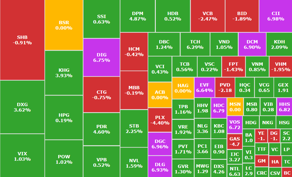 Đáng chú ý nhất trong phiên là sự trở lại của nhóm bất động sản sau nhiều ngày liên tiếp suy yếu. Hàng loạt cổ phiếu tăng mạnh, thậm chí tăng trần như CEO, HDC và DIG. Các mã khác cũng ghi nhận diễn biến tích cực như DXG tăng 3,6%, PDR tăng 4,6%, NLG tăng 3,36% và NVL tăng 1,59%. Diễn biến này cho thấy dòng tiền đang quay trở lại nhóm cổ phiếu có tính chu kỳ cao, trong bối cảnh mặt bằng giá đã điều chỉnh về vùng hấp dẫn hơn.
