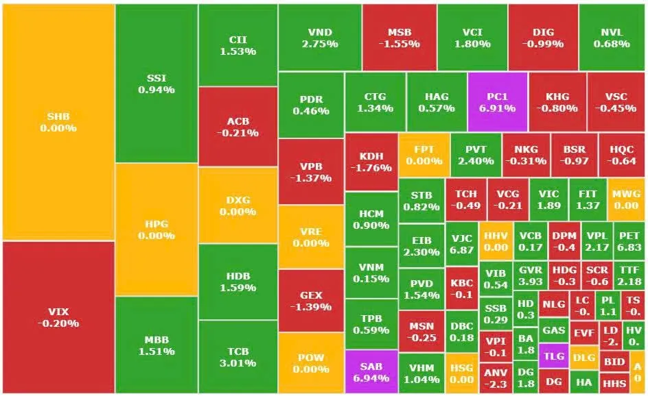 Ngược chiều với thị trường, nhóm bất động sản lại chịu áp lực điều chỉnh do bộ ba nhà Vingroup giảm giá. VIC, VPL, VRE đồng loạt lùi điểm, trong khi VHM đứng tham chiếu. Dù vậy, tác động tiêu cực từ nhóm này nhanh chóng được hấp thụ bởi lực tăng mạnh của nhóm ngân hàng và bán lẻ.