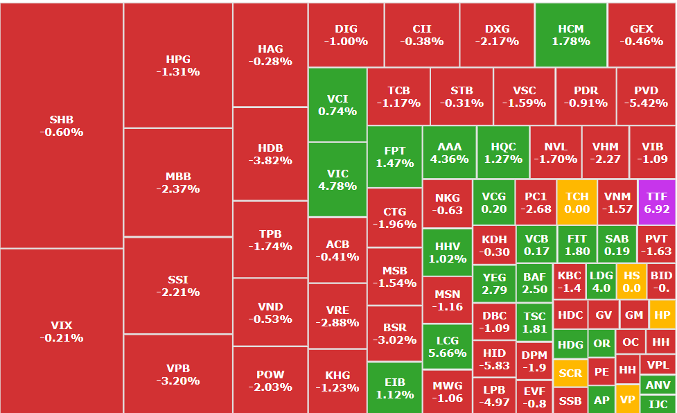 Trái ngược hoàn toàn với VIC, hàng loạt bluechip giảm sâu, gây áp lực lớn lên chỉ số. VHM mất 2,27%, VPB giảm 3,2%, HDB lùi 3,82%, VJC giảm tới 3,1%, MBB mất 2,37%. Nhóm tài chính – ngân hàng, vốn chiếm tỷ trọng lớn, chìm trong sắc đỏ, kéo nhóm ngành “tổ chức tín dụng” giảm 1,33%. Các mã như TCB, SSI, CTG, SHB đều đồng loạt suy yếu, thể hiện tâm lý dè dặt của dòng tiền trước những thông tin vĩ mô chưa thực sự tích cực.