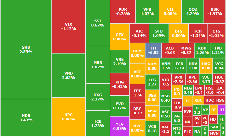 Bản đồ thị trường cho thấy nhóm tài chính tiếp tục là tâm điểm với sự phân hóa mạnh. HDB tăng hơn 3,4%, SHB tăng 2,55%, TCB và STB duy trì sắc xanh, trong khi VIX giảm hơn 1% và một số cổ phiếu chứng khoán giao dịch kém tích cực. Ở nhóm bất động sản, diễn biến trái chiều khi VRE, DXG, QCG tăng điểm, còn VIC, PDR, NBB chịu áp lực điều chỉnh.