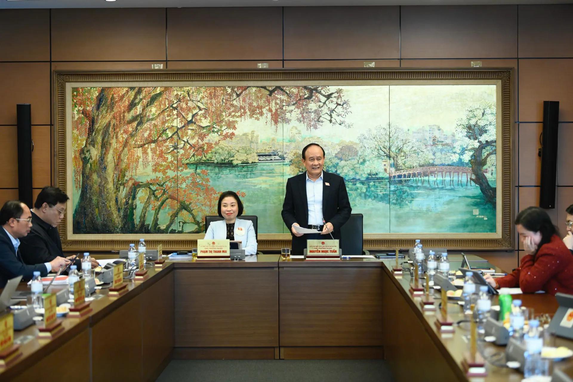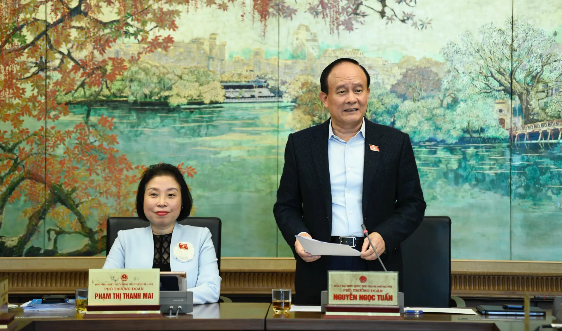 Lãnh đạo Đoàn đại biểu Quốc hội TP Hà Nội chủ trì phiên thảo luận tổ ngày 21/11. Ảnh: Như Ý