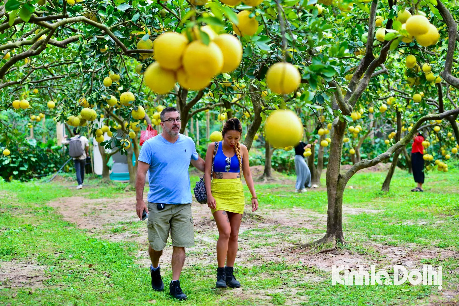 Du khách tấp nập tới check-in tại vườn bưởi Diễn chín vàng sai trĩu quả