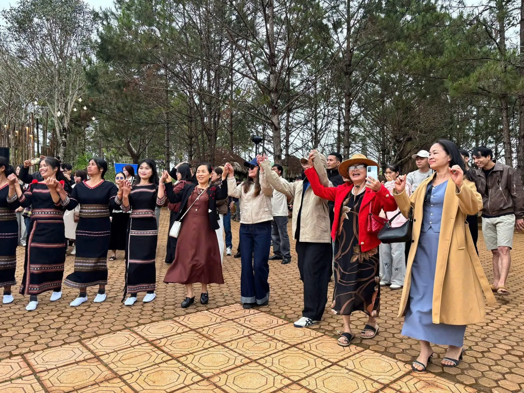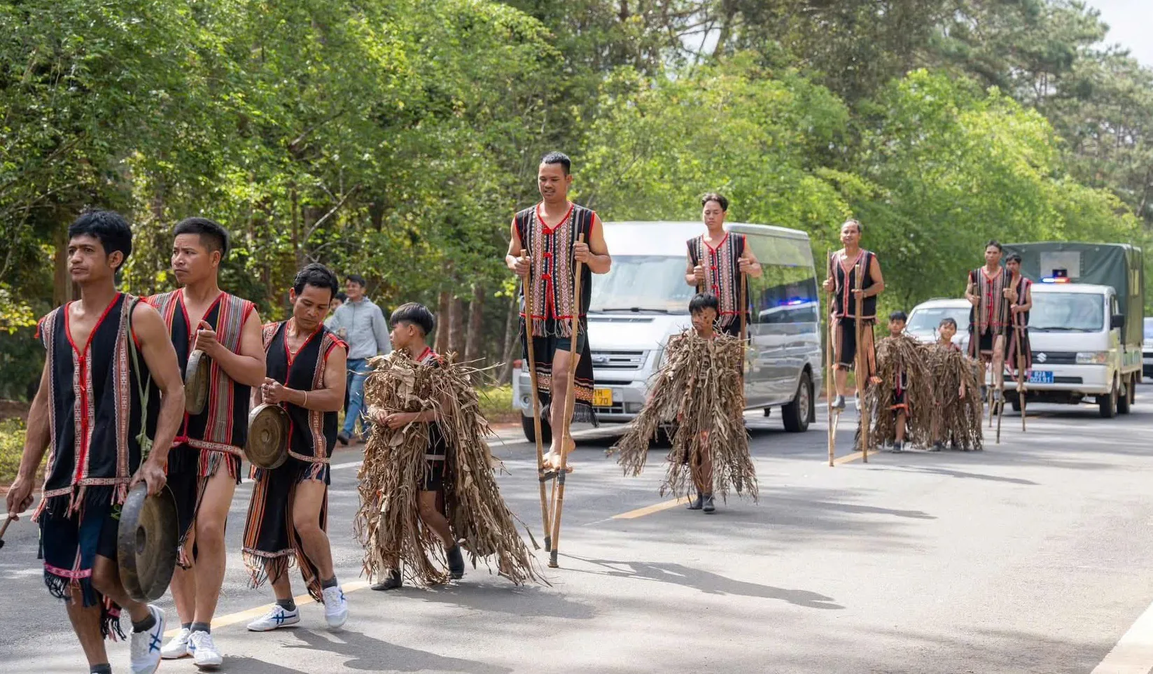 Khoảng 50 nghệ nhân trong trang phục truyền thống rực rỡ sắc màu tham gia diễu hành, trình diễn nghệ thuật dân gian. Tiếng cồng chiêng ngân vang giữa núi rừng, hòa cùng nhịp xoang rộn ràng tạo nên bức tranh văn hóa sống động trong những ngày đầu năm mới. Các nghệ nhân vừa trình diễn cồng chiêng, múa xoang, vừa biểu diễn nhạc cụ dân tộc và đi cà kheo dọc tuyến phố, mang lại trải nghiệm mới lạ cho du khách.