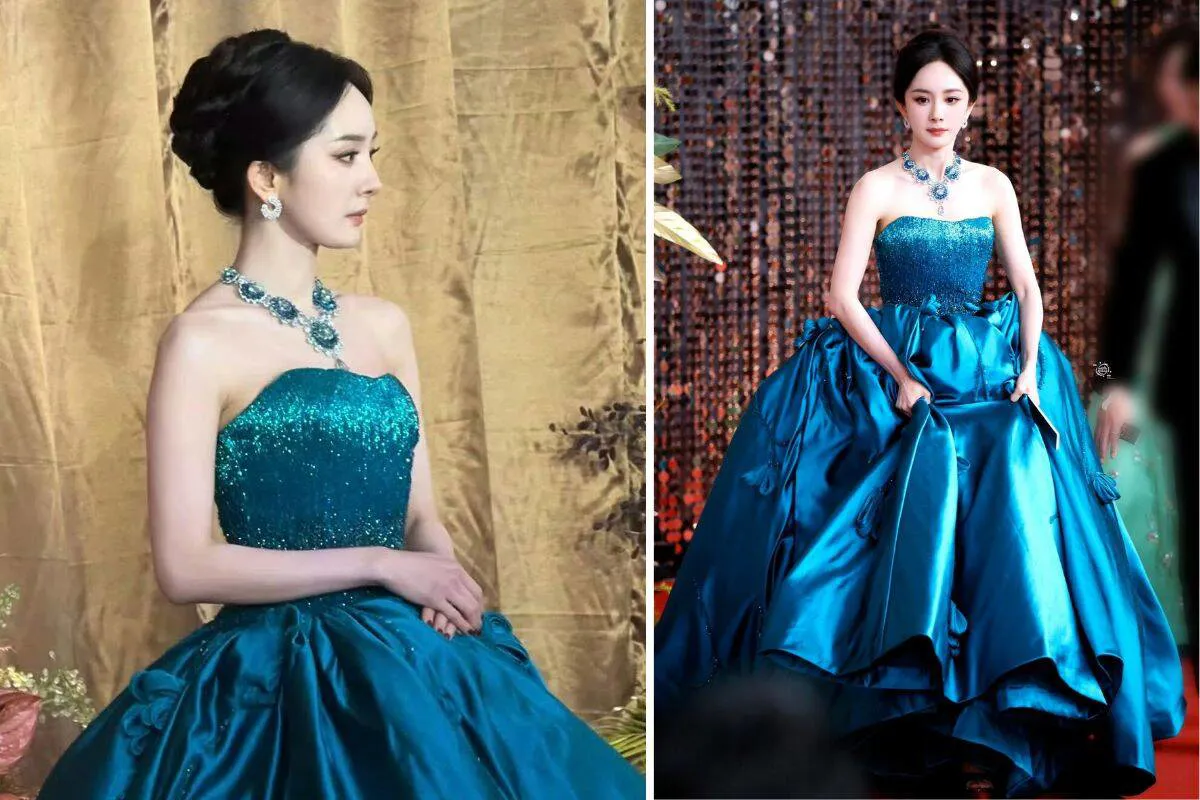 Nữ diễn viên diện đầm lụa màu xanh lam có thiết kế cúp ngực, thân bồng xòe, với những chi tiết kim tuyến lấp lánh. Cô tạo thêm điểm nhấn với bộ trang sức cùng màu của thương hiệu xa xỉ Chopard.