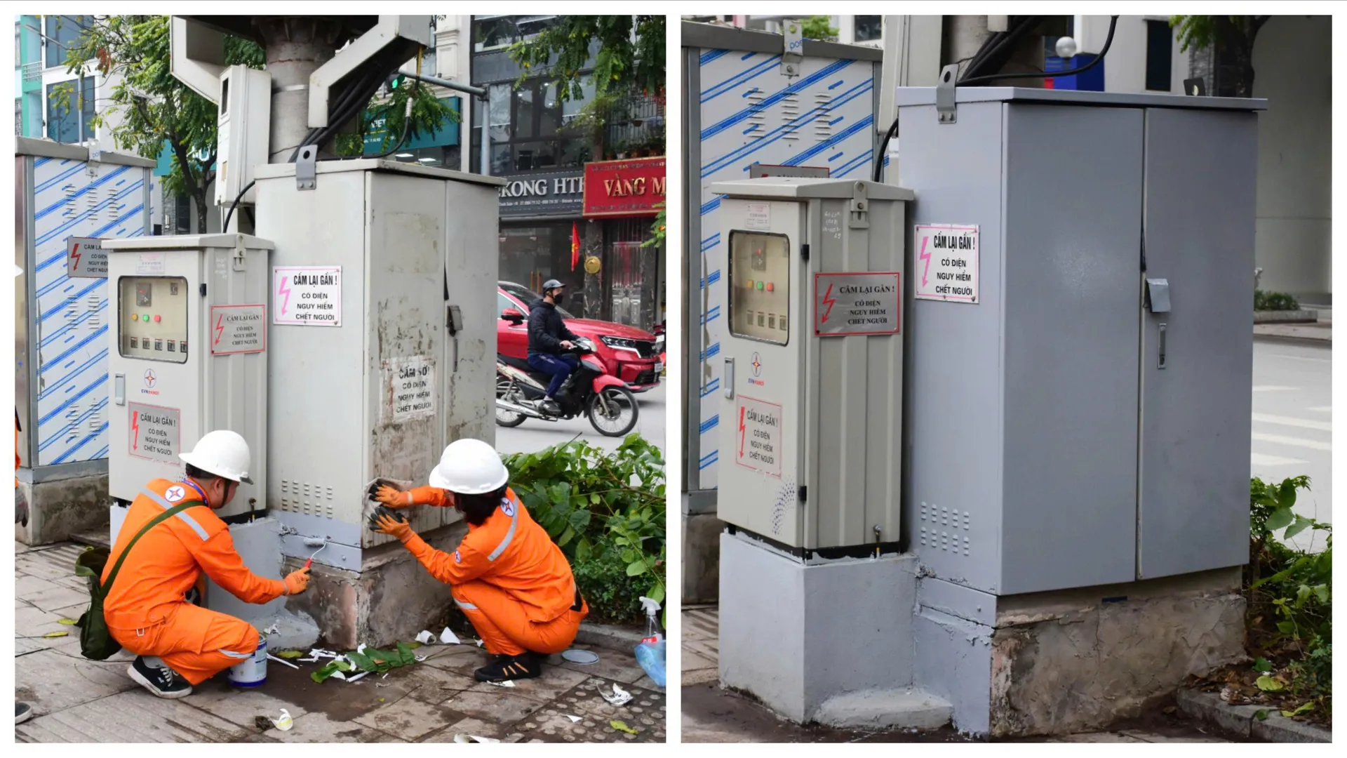 Công tác chỉnh trang hạ tầng lưới điện không chỉ tập trung bó gọn, sắp xếp lại dây dẫn điện và dây viễn thông trên cột, mà còn bao gồm vệ sinh, sơn sửa vỏ tủ, trạm biến áp. Đồng thời, EVNHANOI cũng đã thay thế thiết bị xuống cấp, góp phần loại bỏ tình trạng những bó dây chằng chịt từng gây mất mỹ quan và tiềm ẩn nguy cơ mất an toàn điện. Nhờ nỗ lực chỉnh trang, các vị trí đã được xử lý gọn gàng hơn, nâng cao thẩm mỹ đô thị, đặc biệt trên các tuyến phố trung tâm và khu vực công cộng.