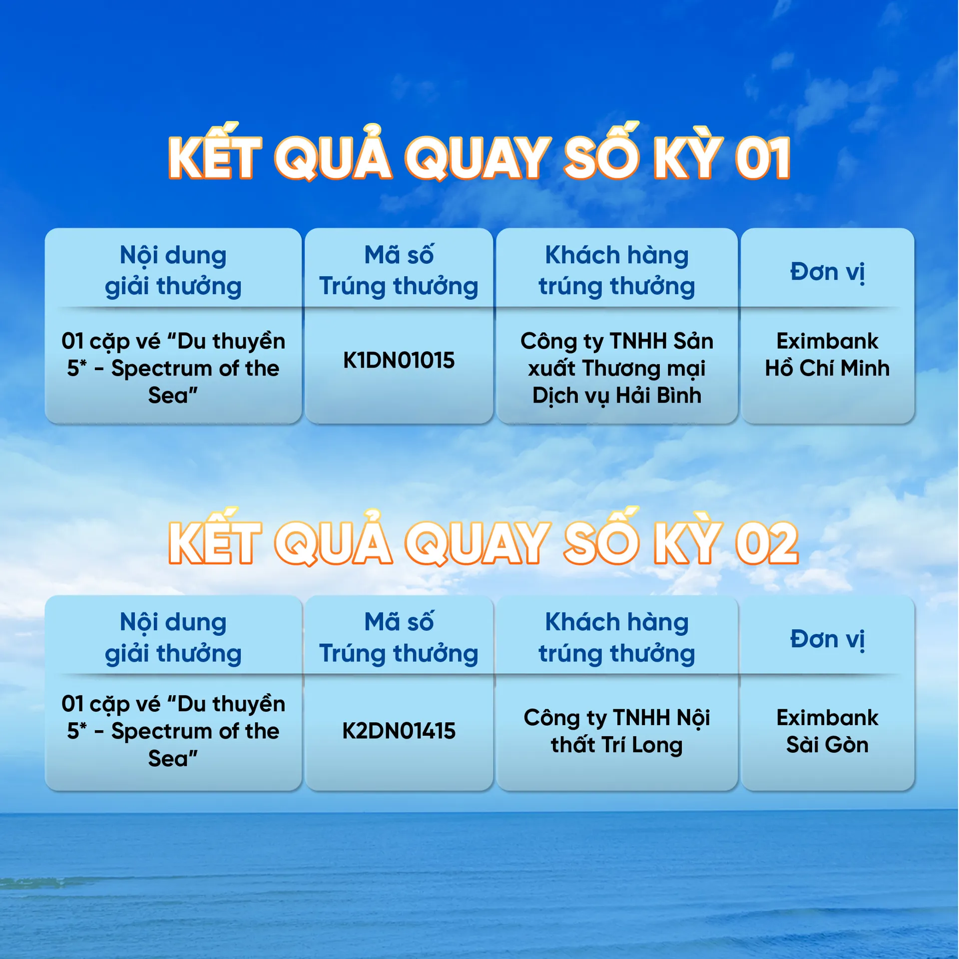 Ở kỳ quay số 1 và 2, 02 cặp vé du lịch châu Á trên du thuyền 5 sao Spectrum Of The Seas trị giá 100 triệu/mỗi giải đã tìm được chủ nhân là 02 khách hàng doanh nghiệp may mắn của chương trình.