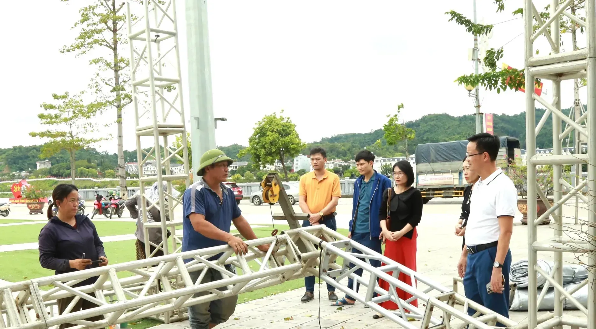 Lãnh đạo Sở Văn hóa, Thể thao và Du lịch kiểm tra công tác chuẩn bị cho Festival sông Hồng tại phường Lào Cai. Ảnh: Báo Lào Cai