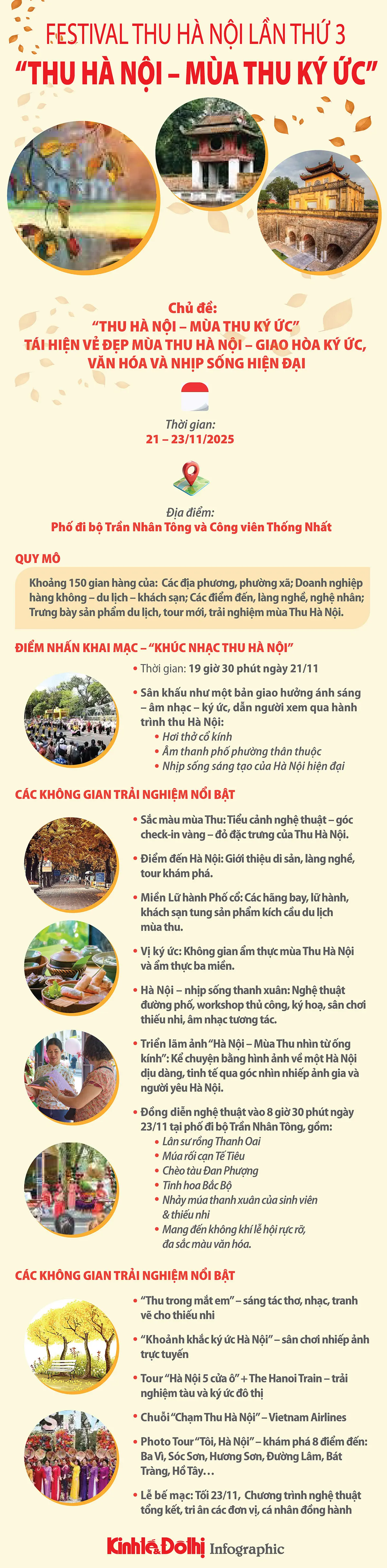 Kinhtedothi - “Thu Hà Nội – Mùa Thu ký ức” không chỉ kể lại những ký ức cũ mà còn tạo nên những ký ức mới – trong trẻo, lắng đọng – dành cho người dân Thủ đô, du khách trong nước và bạn bè quốc tế. Festival Thu Hà Nội năm 2025 không chỉ là sự kiện du lịch, mà là lời mời gọi mỗi người tìm về ký ức mùa Thu Hà Nội: tiếng lá vàng, mùi hoa sữa, nắng chiều Hồ Tây, bước chân thong dong trên hè phố.