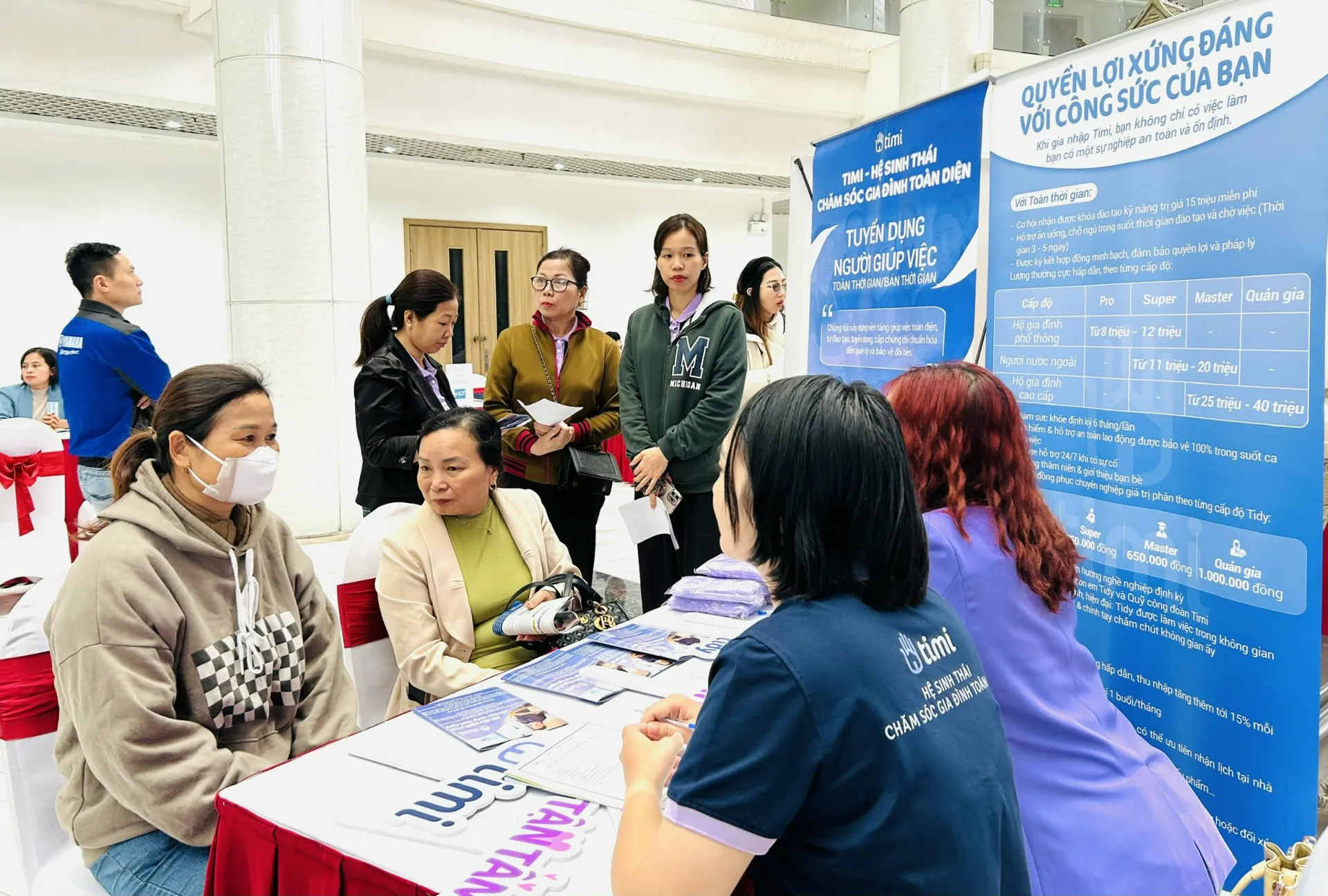 Người lao động tìm hiểu thông tin việc làm tại bàn tuyển dụng Công ty TNHH Timi Service. Ảnh: Trần Oanh.