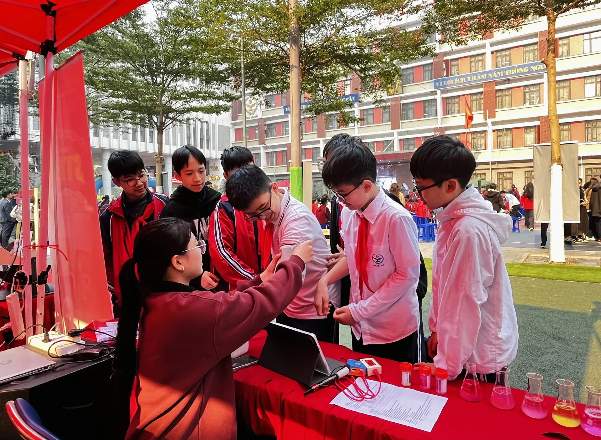 Tại đó, học sinh hào hứng tham quan các gian trưng bày sản phẩm ứng dụng AI, khoa học kỹ thuật, khởi nghiệp các cấp, sản phẩm STEM của chính học sinh nhà trường phát minh, sáng chế.