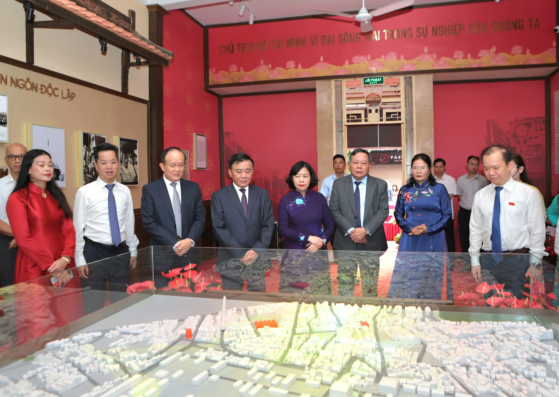 Các đồng chí lãnh đạo Trung ương và thành phố Hà Nội thực hiện nghi thức cắt băng khai mạc trưng bày triển lãm tại di tích lưu niệm 48 Hàng Ngang.