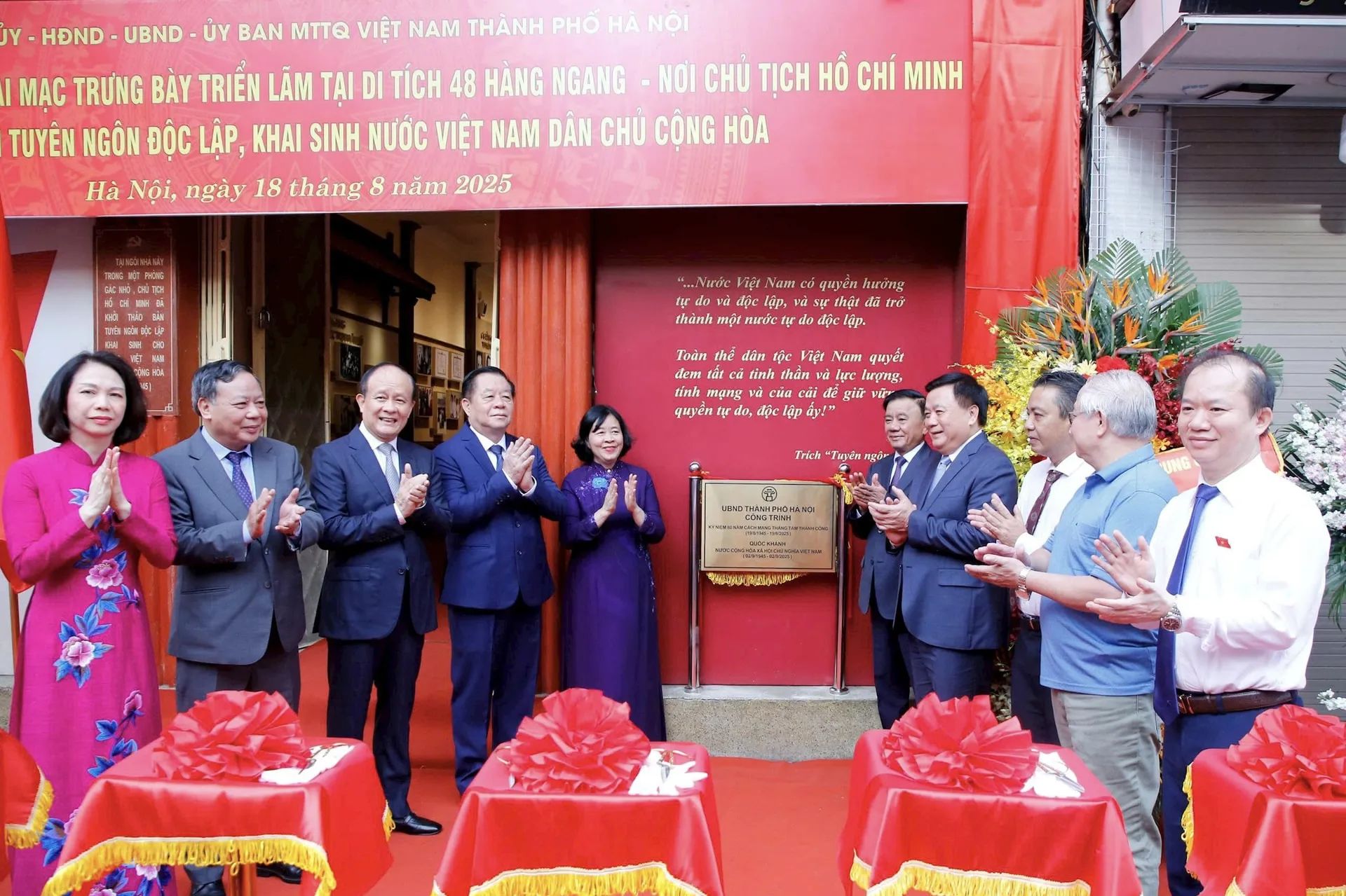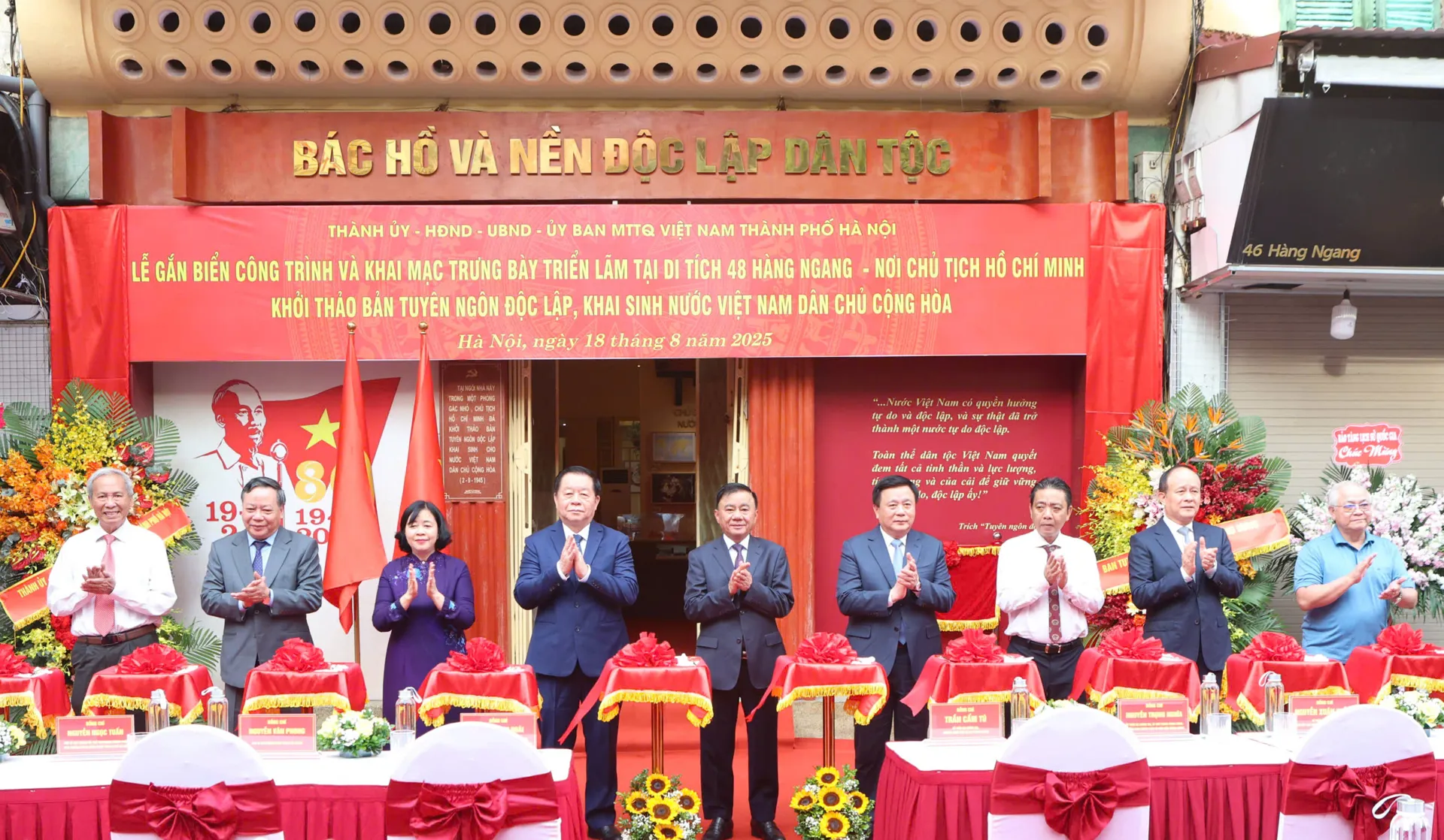 Kinhtedothi - Sáng 18/8, Thành ủy - HĐND - UBND - Ủy ban MTTQ Việt Nam TP Hà Nội tổ chức lễ gắn biển công trình và trưng bày triển lãm tại di tích lịch sử 48 Hàng Ngang, phường Hoàn Kiếm, Hà Nội. Đây là hoạt động trọng tâm nằm trong chuỗi các sự kiện của thành phố Hà Nội chào mừng kỷ niệm 80 năm Cách mạng Tháng Tám thành công (19/8/1945 - 19/8/2025) và Quốc khánh nước Cộng hòa xã hội chủ nghĩa Việt Nam (2/9/1945 - 2/9/2025).
