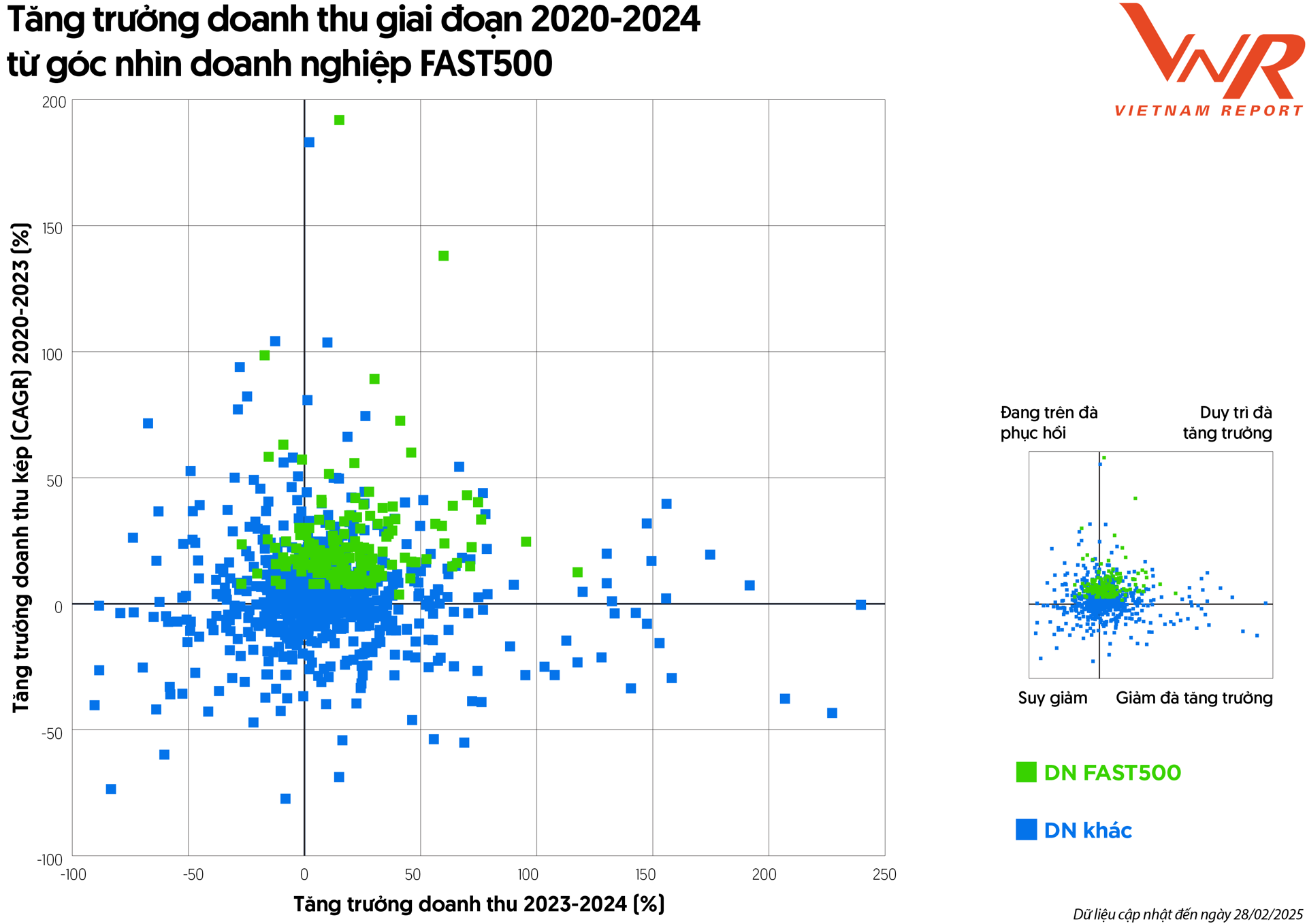 Theo Vietnam Report, Các doanh nghiệp thuộc Top 500 Doanh nghiệp tăng trưởng nhanh nhất Việt Nam (FAST500) năm 2025 đã thể hiện sự bền bỉ ấn tượng trước hàng loạt biến động kể từ năm 2020 trở lại đây. Căn cứ vào số liệu tài chính năm 2024, Vietnam Report cho rằng, các doanh nghiệp FAST500 không chỉ duy trì tốc độ tăng trưởng doanh thu ổn định trong giai đoạn 2020-2023 mà tiếp tục có mức tăng trưởng tích cực trong năm 2024, trong khi nhóm còn lại có sự phân tán rộng, với nhiều điểm dữ liệu rơi vào vùng suy giảm hoặc giảm đà tăng trưởng.