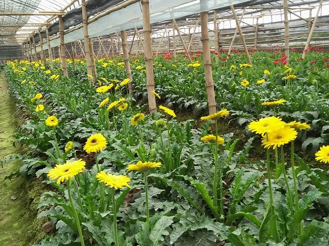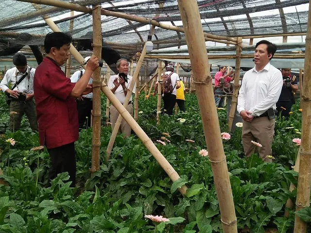 | Đoàn văn nghệ sỹ tham quan vườn hoa đồng tiền của người dân Tây Tựu. |