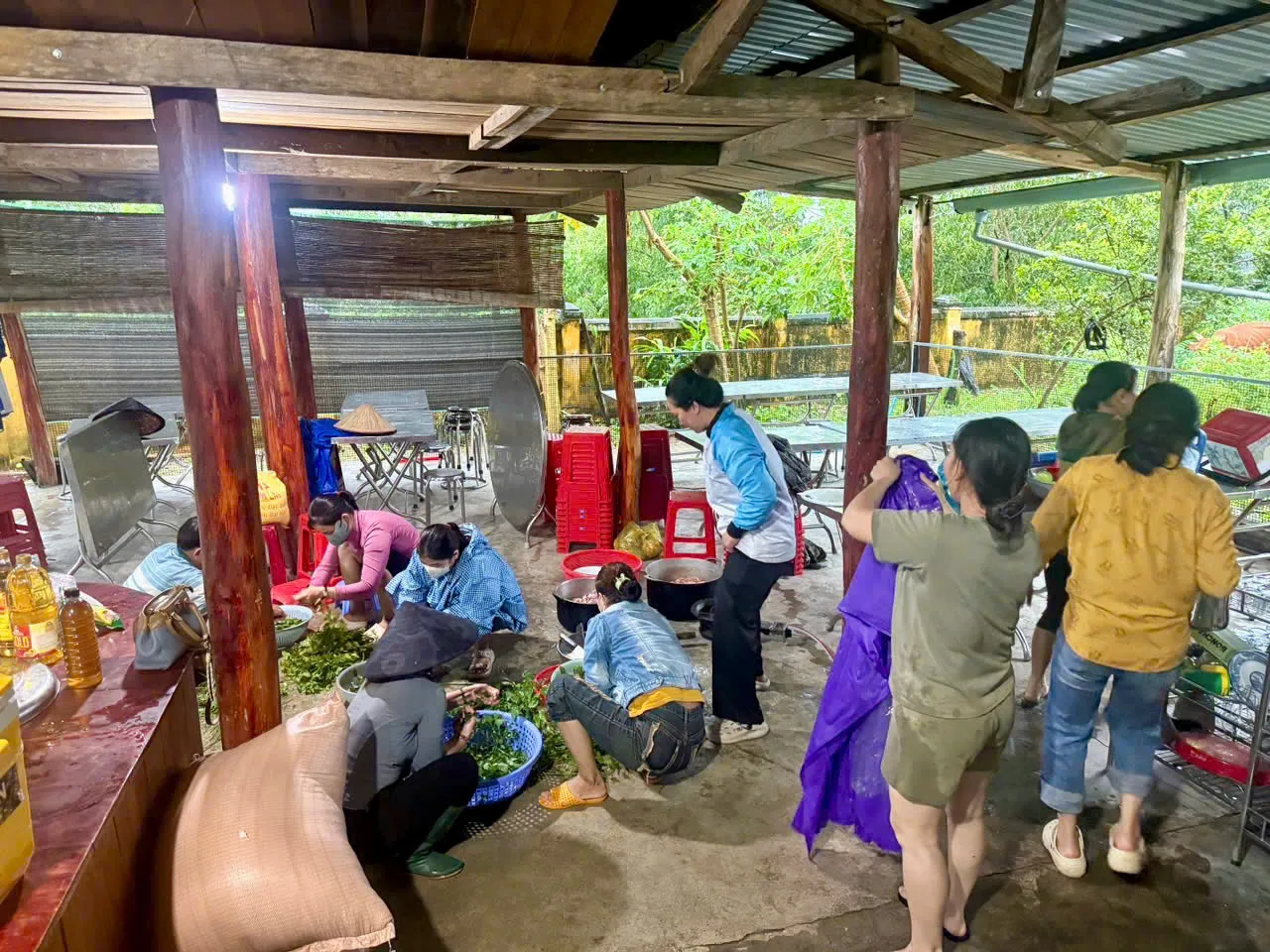 Nhóm chị em phụ nữ và các đoàn thể được huy động nguồn lực để tổ chức nấu ăn tại trụ sở Công an xã và các trường học đảm bảo phục vụ bữa ăn nóng và đầy đủ dinh dưỡng cho bà con chạy lũ.