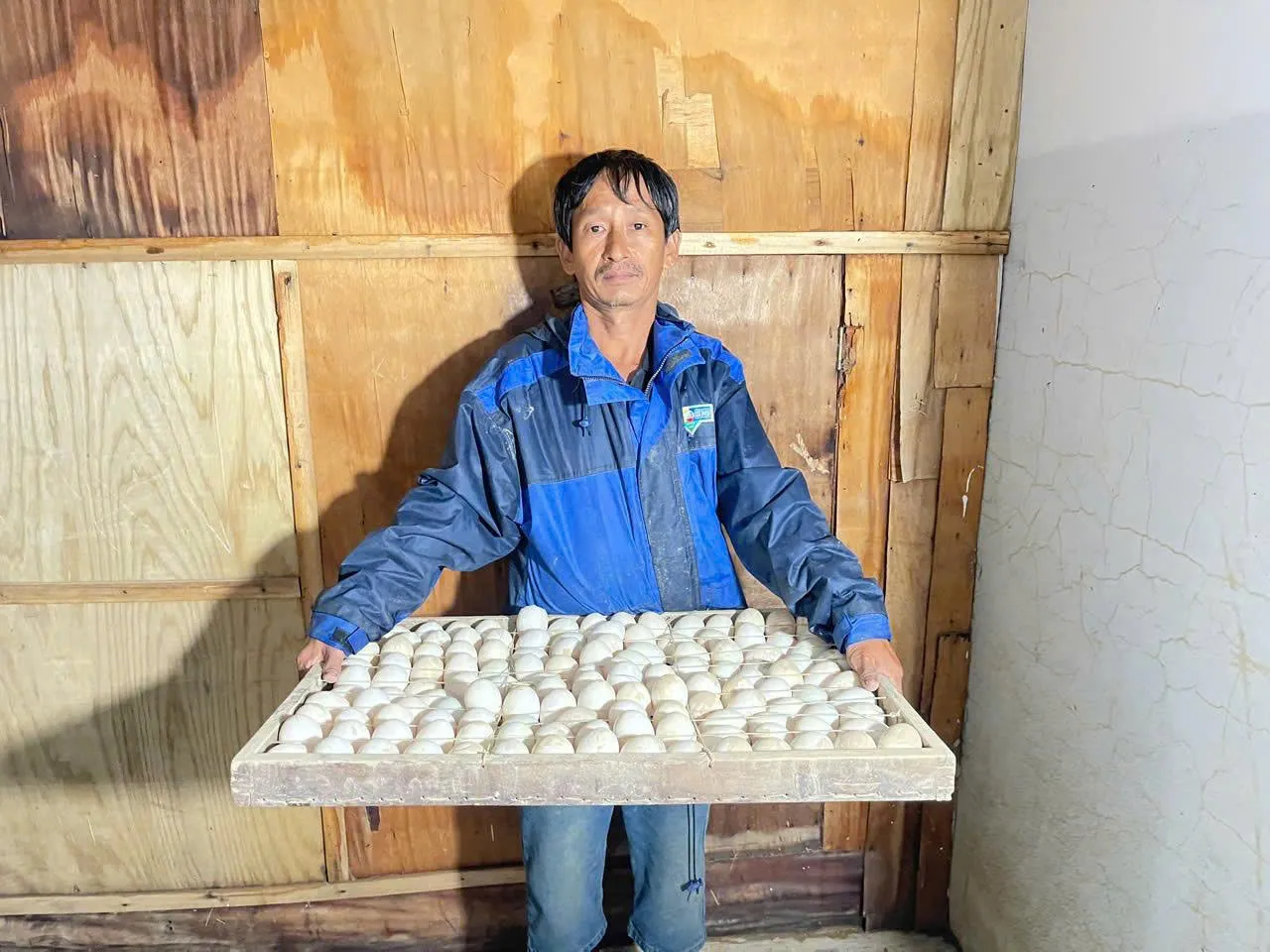 Ông Kiểu buồn bã bên những mẻ trứng không đạt chất lượng khi bị ảnh hưởng của lũ.