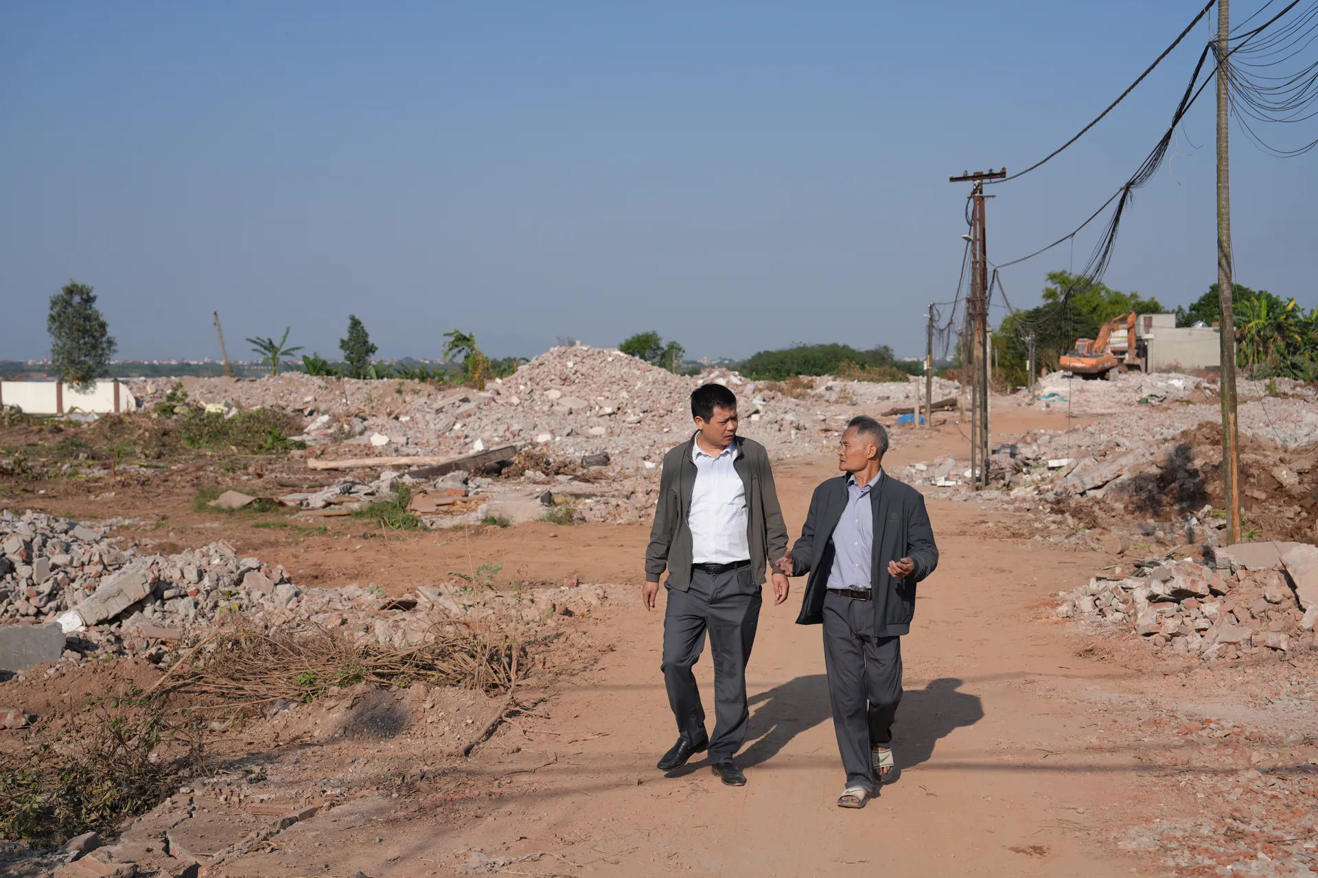 Phó Trưởng phòng Kinh tế xã Ô Diên Nguyễn Phúc Hoàn (trái) và ông Nguyễn Văn Mến, thôn Bồng Lai, xã Ô Diên trao đổi về công tác giải phóng mặt bằng dự án đường Vành đài 4 - Vùng Thủ đô.
