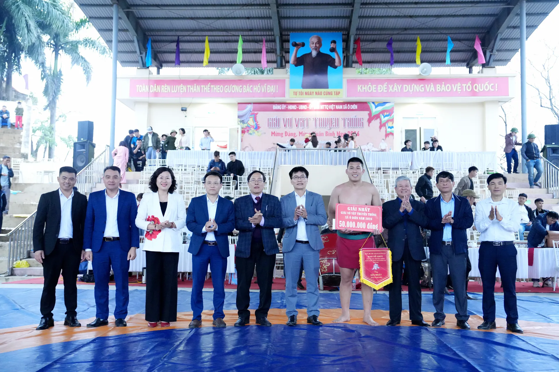 Phó Bí thư Thường trực Đảng ủy xã Ô Diên Phạm Hồng Hoàn cùng Ban Tổ chức trao giải Nhất nội dung nam cho đô vật Hoàng Văn Nam (TP Hải Phòng).