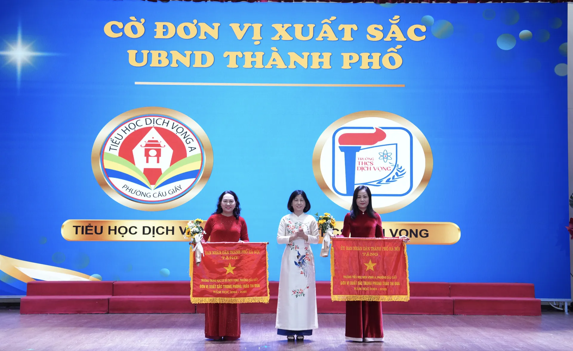 Phó Chủ tịch UBND phường Cầu Giấy Nguyễn Thu Hà trao Cờ thi đua của Thành phố cho các cơ sở giáo dục đạt thành tích xuất sắc trong năm học 2024 - 2025.