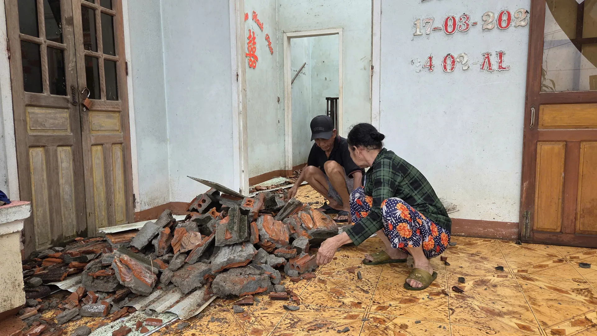 Người dân thu dọn các mảnh ngói, xi măng vỡ nát
