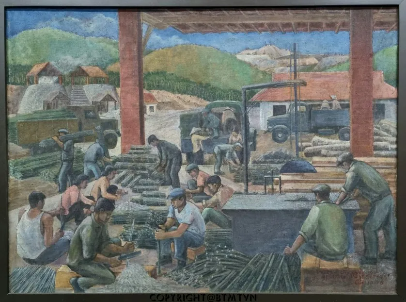 Tác phẩm "Công nhân Hà Tu vót chông" của Ngô Phương Cúc, tranh sơn dầu, năm 1978.