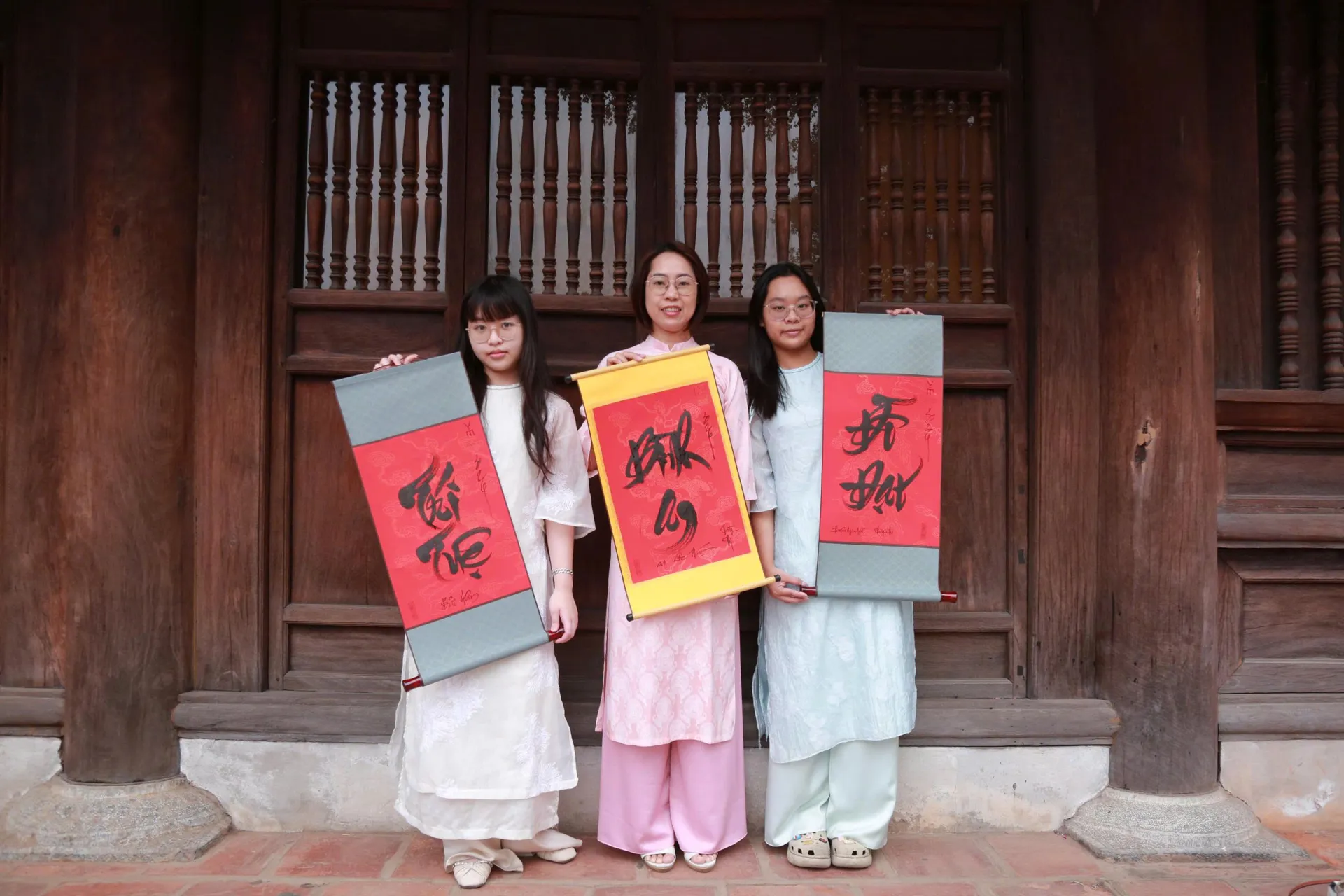 Chị Thanh Hòa và hai con gái nâng niu những bức chữ, cũng như tâm nguyện đầu năm vừa được gửi gắm. Ảnh: Tuyết Linh