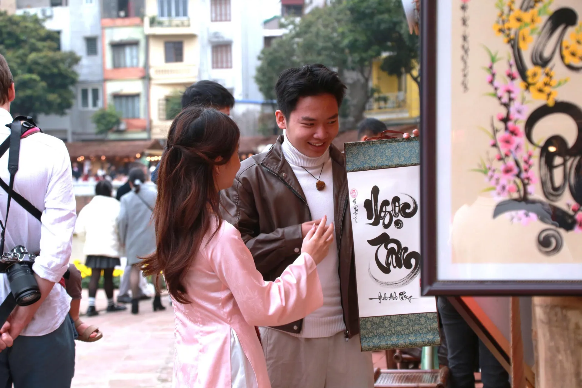 Nhiều gia đình đưa con em đến xin chữ như một hình thức giáo dục truyền thống, giúp các em hiểu và thêm trân trọng giá trị văn hóa dân tộc. Ảnh: Tuyết Linh