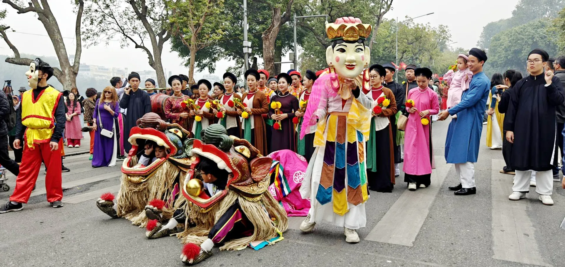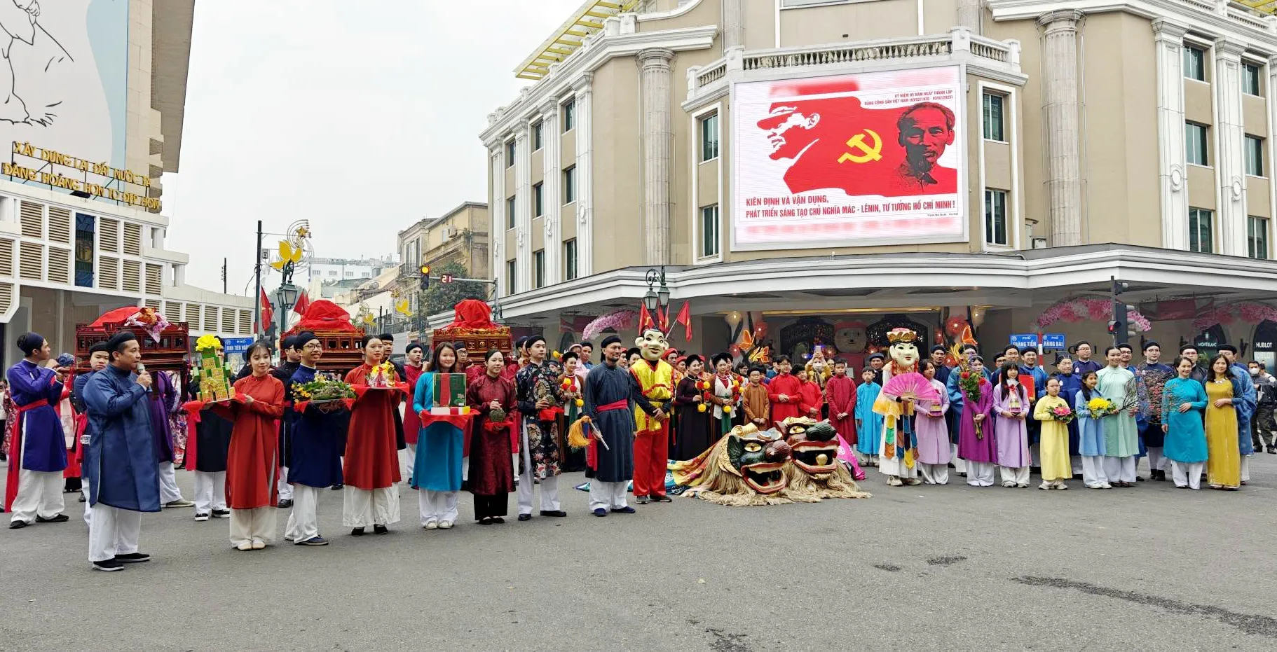 Sáng 19/1, nhiều tuyến phố trung tâm rộn ràng với các hoạt động của Tết Việt – Tết phố 2025. Trong đó ấn tượng nhất phải kể đến là đoàn rước hơn 400 thành viên mặc cổ phục, trang phục truyền thống. Đoàn rước xuất phát từ đình Kim Ngân, số 42 - 44 Hàng Bạc, đi qua các điểm di tích lịch sử của hồ Hoàn Kiếm và phố cổ Hà Nội. Tại các điểm di tích, đoàn rước lễ dừng lại để làm lễ và thực hiện trình diễn một số tiết mục múa, hát dân gian. Điểm cuối của hành trình là đình Kim Ngân (42 Hàng Bạc), sau đó diễn ra lễ dâng Thành hoàng, dựng cây nêu, giới thiệu về lịch sử ý nghĩa của cây nêu ngày Tết, diễn xướng dân gian mừng Xuân mới.